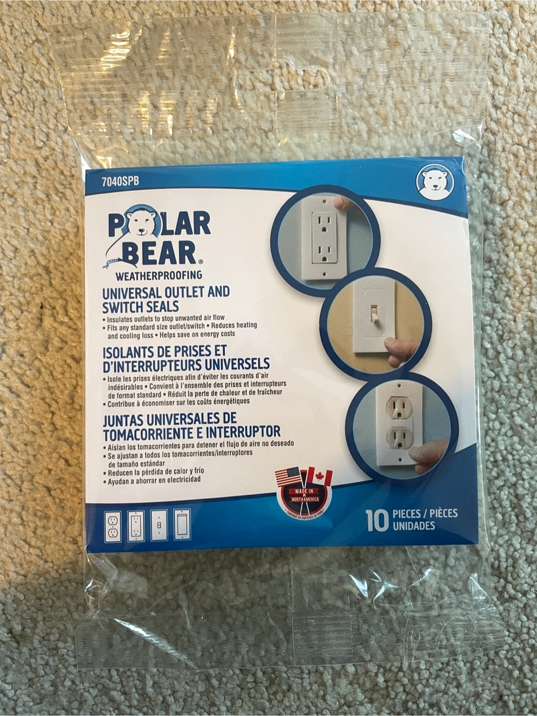 I have a new, unopened pack of Polar Bear Weatherproofing Universal Outlet and Switch Seals. These seals insulate outlets to stop unwanted airflow, which helps reduce heating and cooling loss, saving on energy costs. The pack contains 10 pieces.