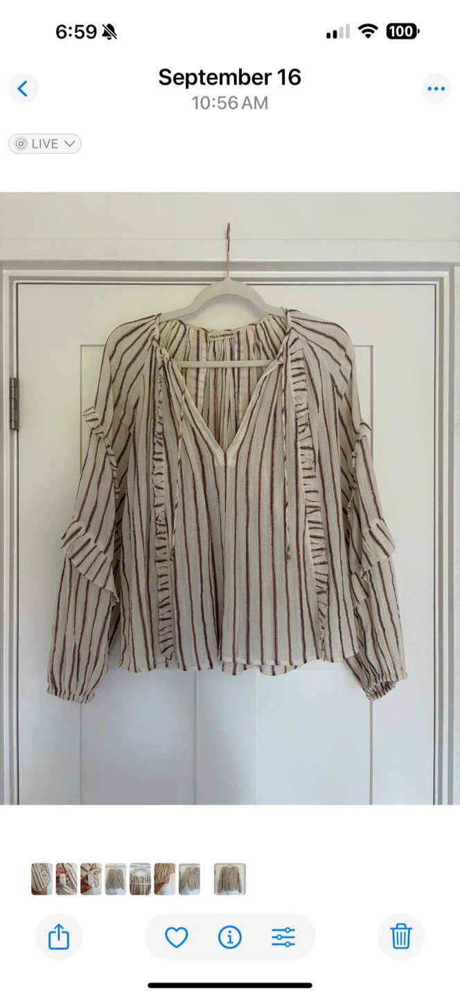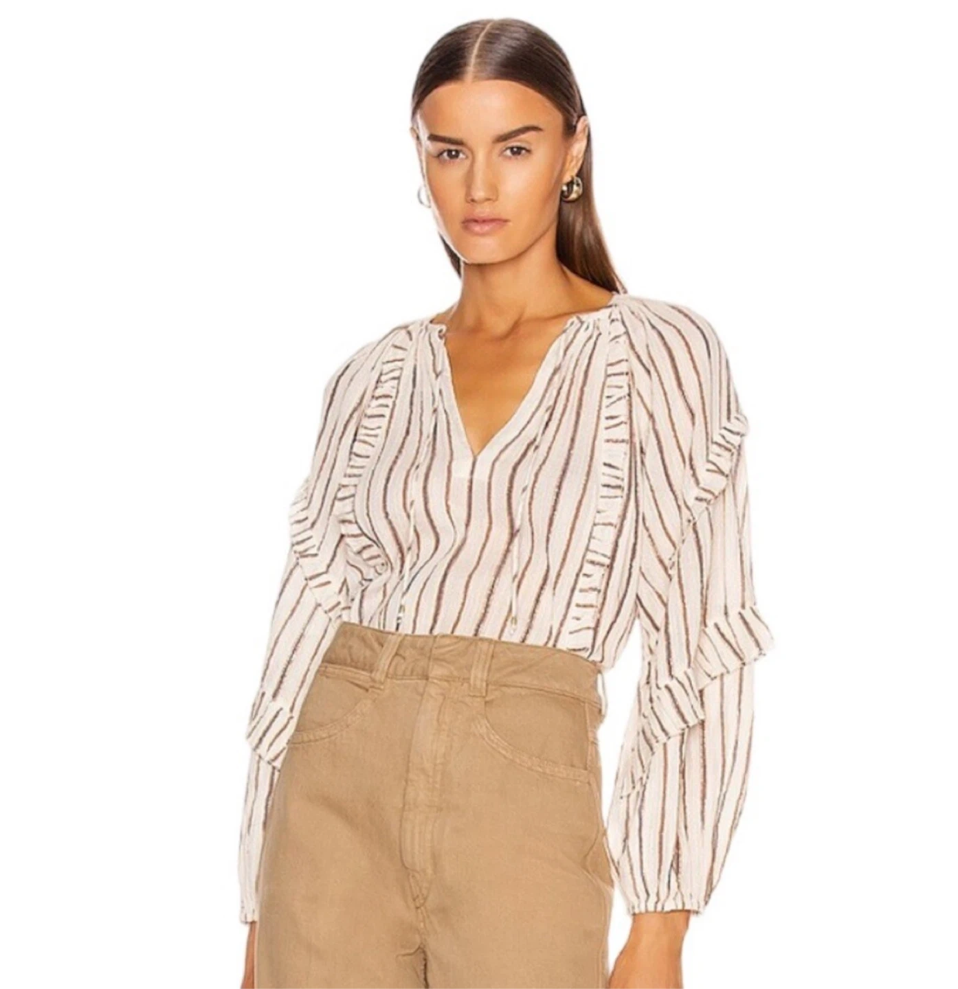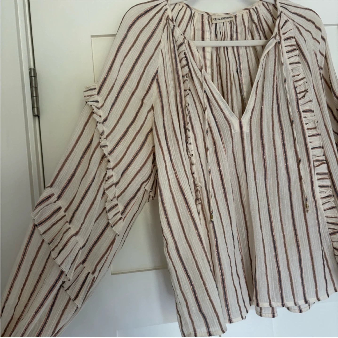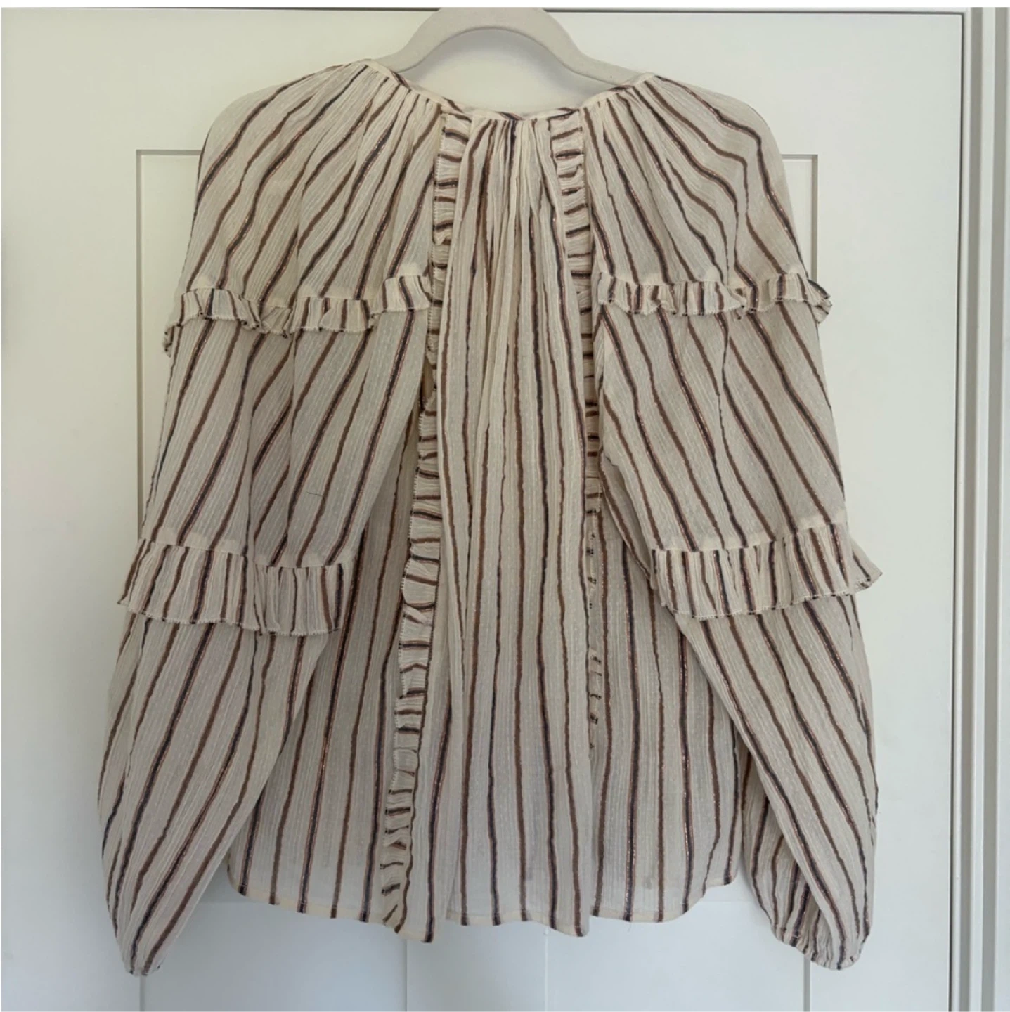 This blouse has slender metallic stripes and a dash of flash to a crinkle-textured cotton blouse with ruffles that set off the look’s voluminous balloon sleeves. Size 6 but it fits oversized. I’m usually an 8 and this fits me perfectly. Excellent condition, no flaws to note Pick up Lynn Valley