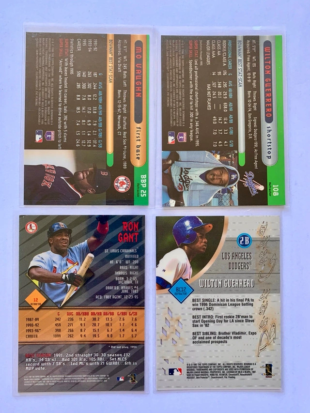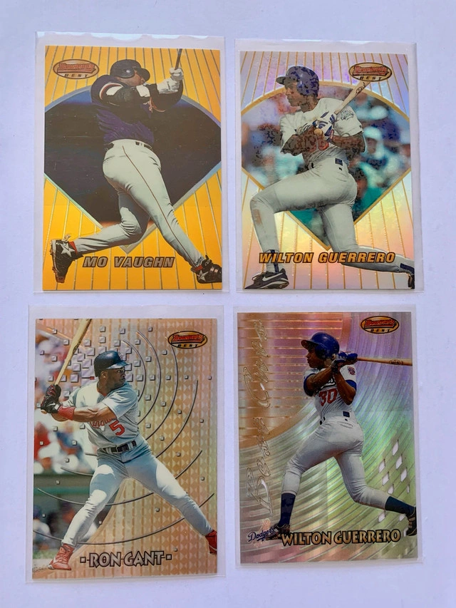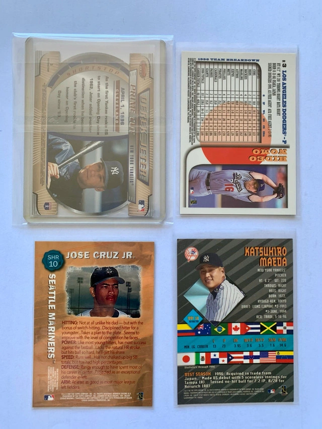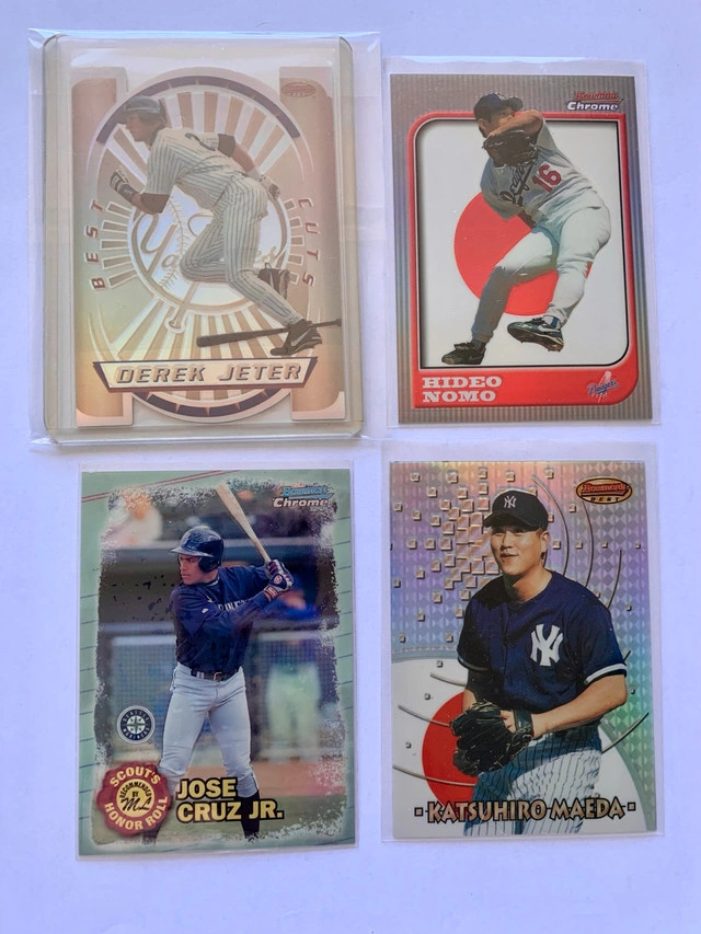 I'm offering a set of 8 MLB refractor cards featuring Derek Jeter, Hideo Nomo, Jose Cruz Jr, Katsushiro Maeda, Mo Vaughn, and Wilton Guerrero. These cards are great for any baseball card collector! They have been stored carefully.