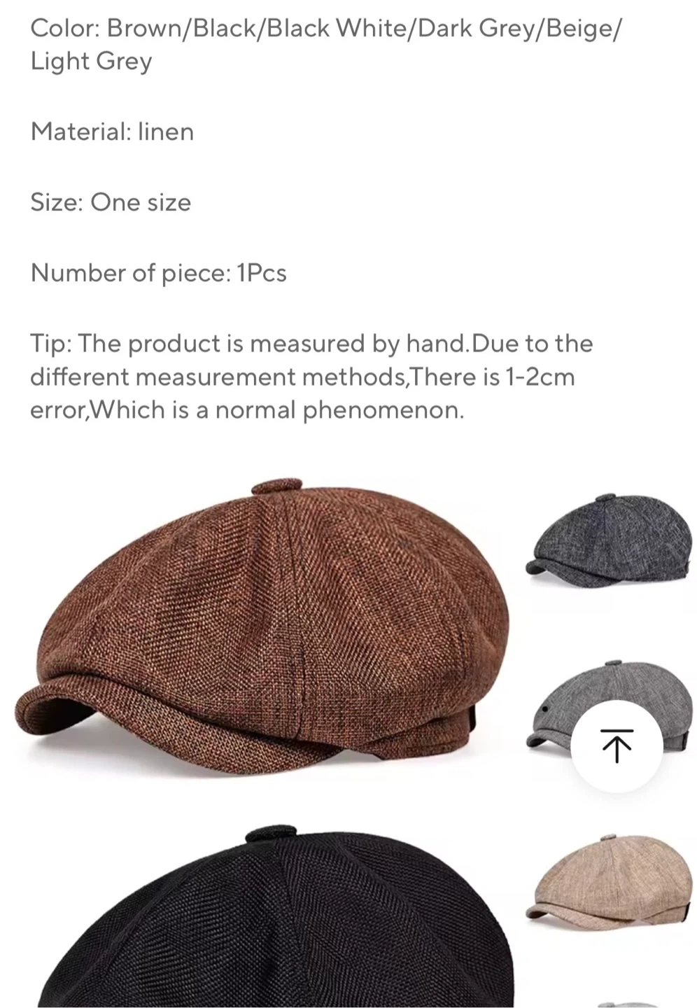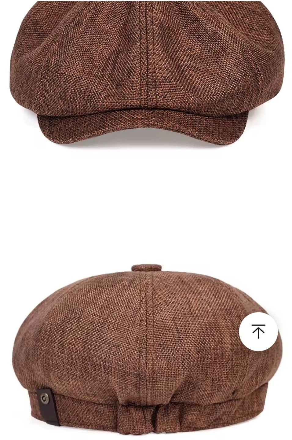 A stylish brown newsboy cap made of linen! It's a one-size-fits-all item, perfect for adding a touch of vintage charm to any outfit