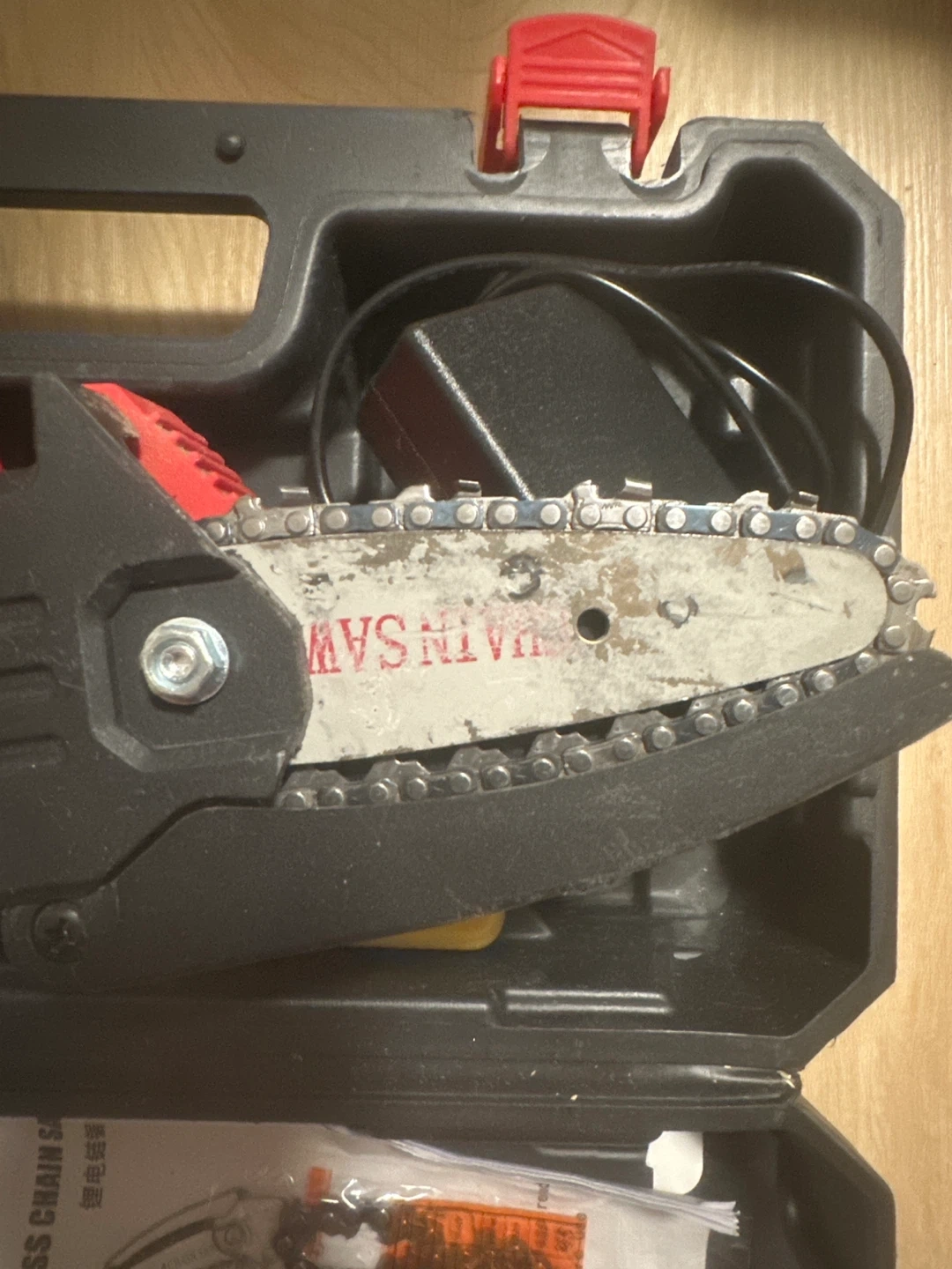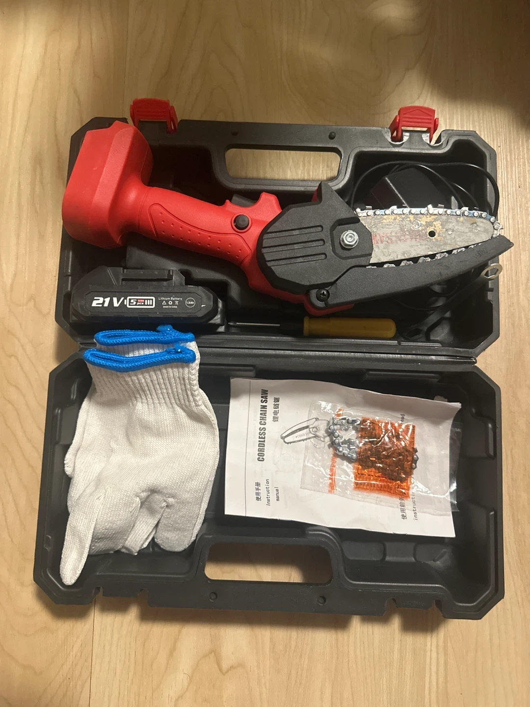 Selling a cordless mini chainsaw. It comes with its case and all the accessories shown in the photos, including a battery, charger, gloves, and extra chain. Great for small jobs around the yard!