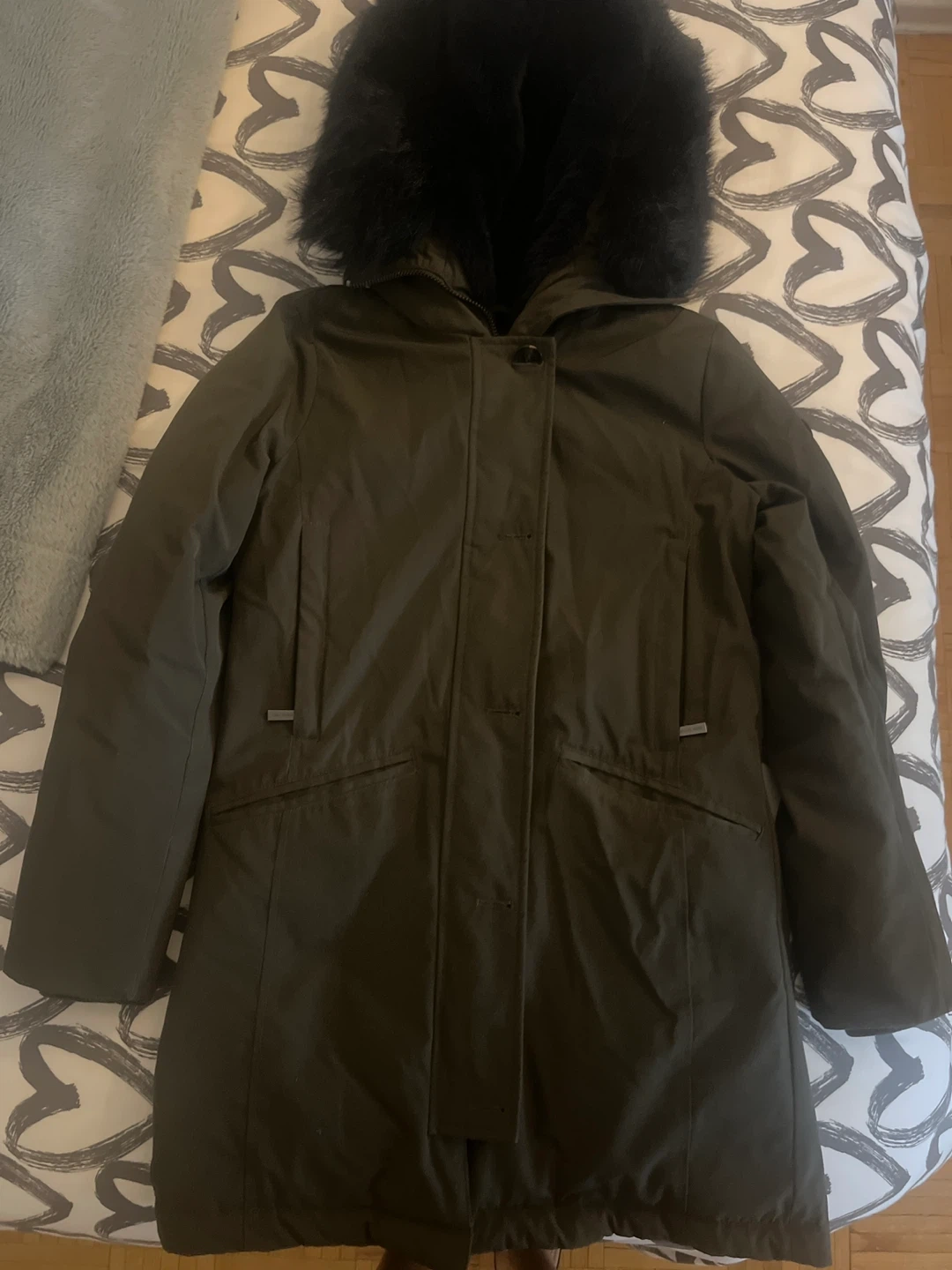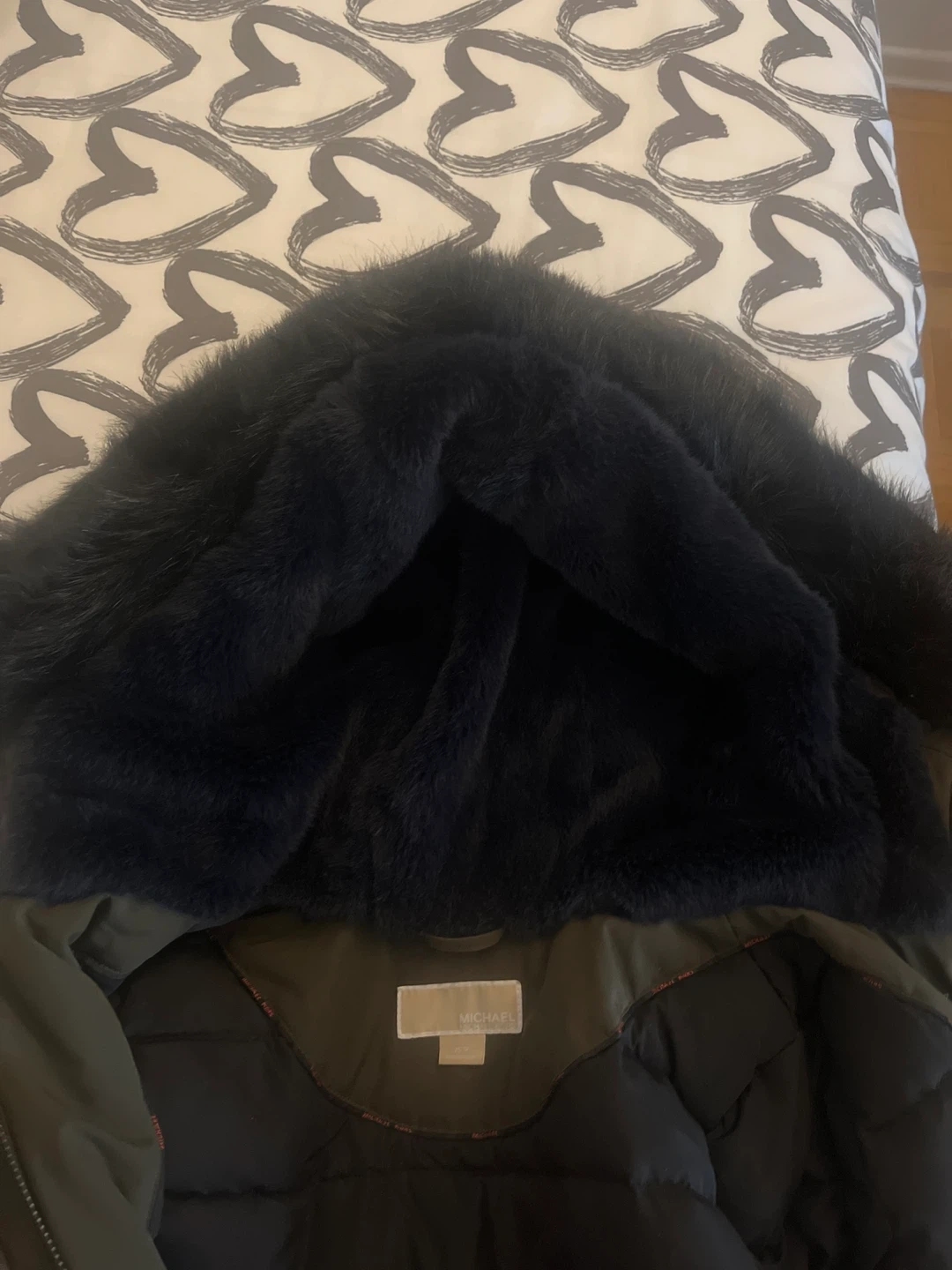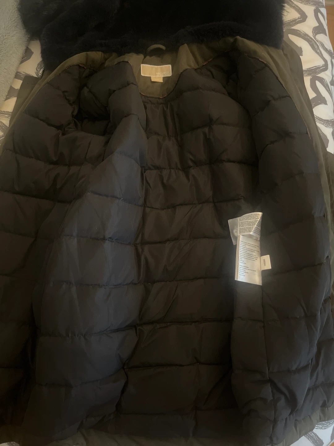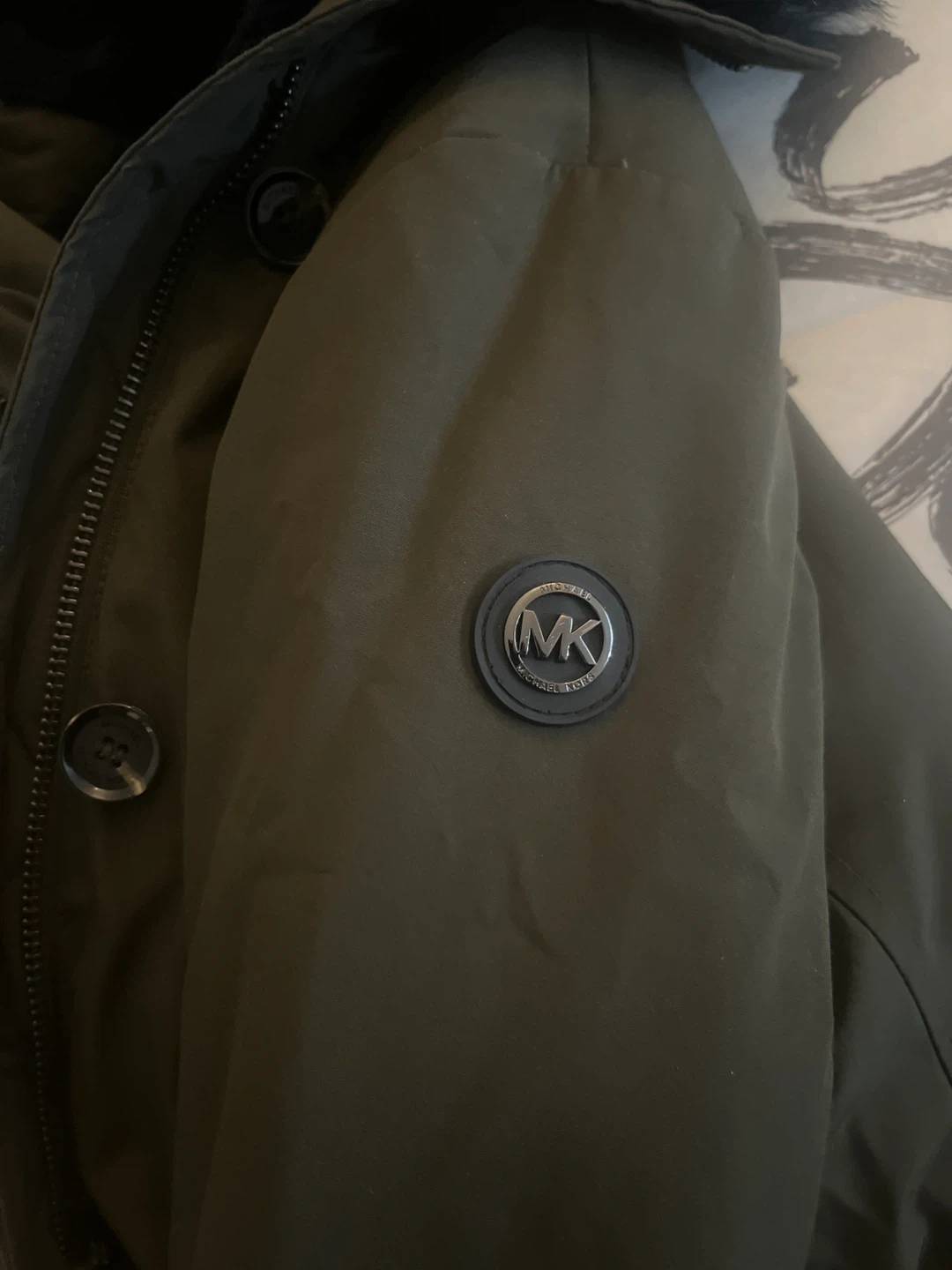 Stay warm this winter with this stylish Michael Kors parka! It's an olive green colour and features a faux fur-trimmed hood. Perfect for those chilly Canadian days!