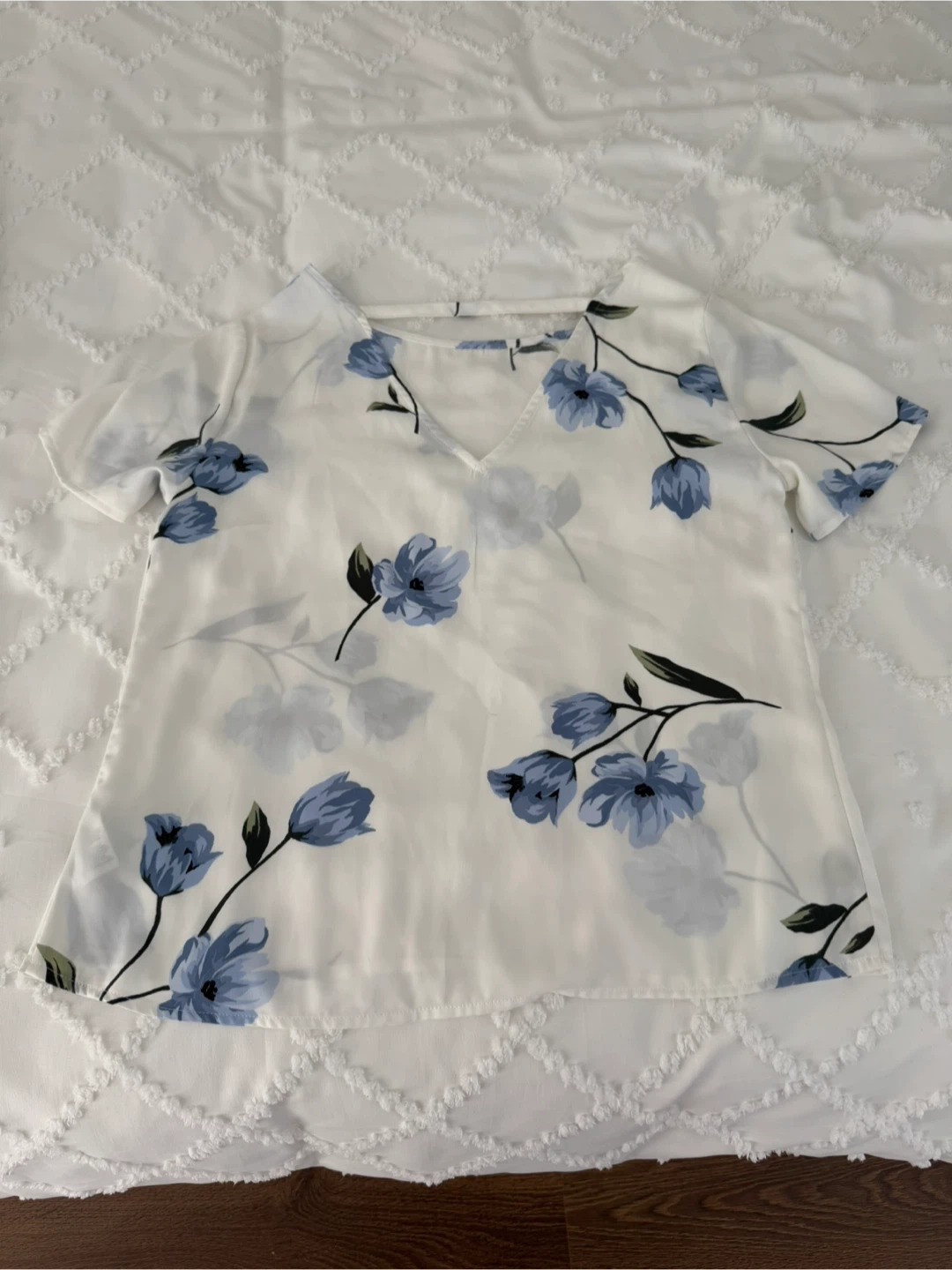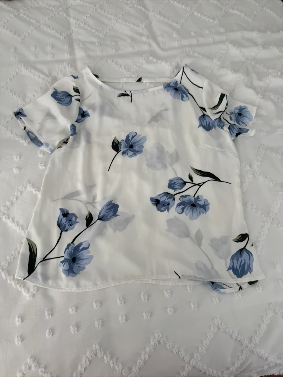 Here's a cute floral print blouse in a size small! It has a lightweight and breezy feel, perfect for warmer weather. The blue floral design adds a touch of charm to any outfit. It's in great condition and ready for a new home