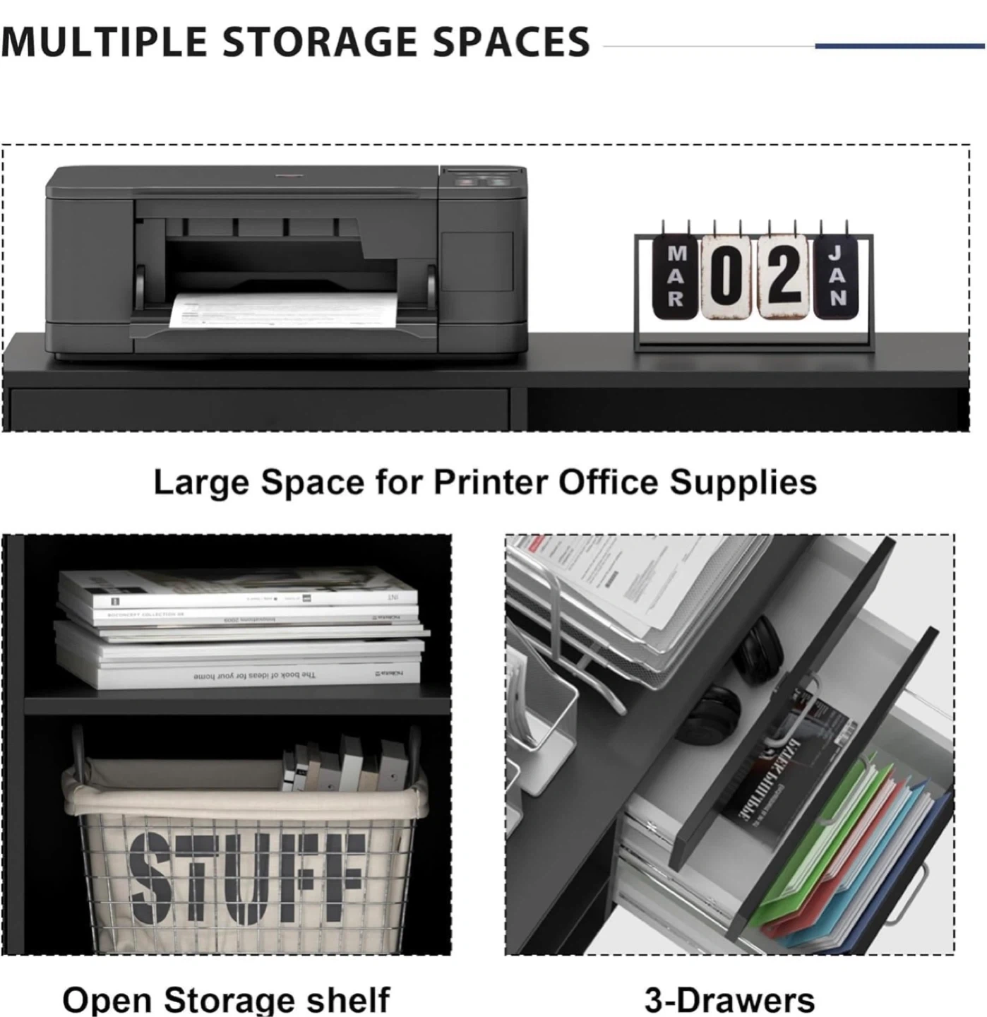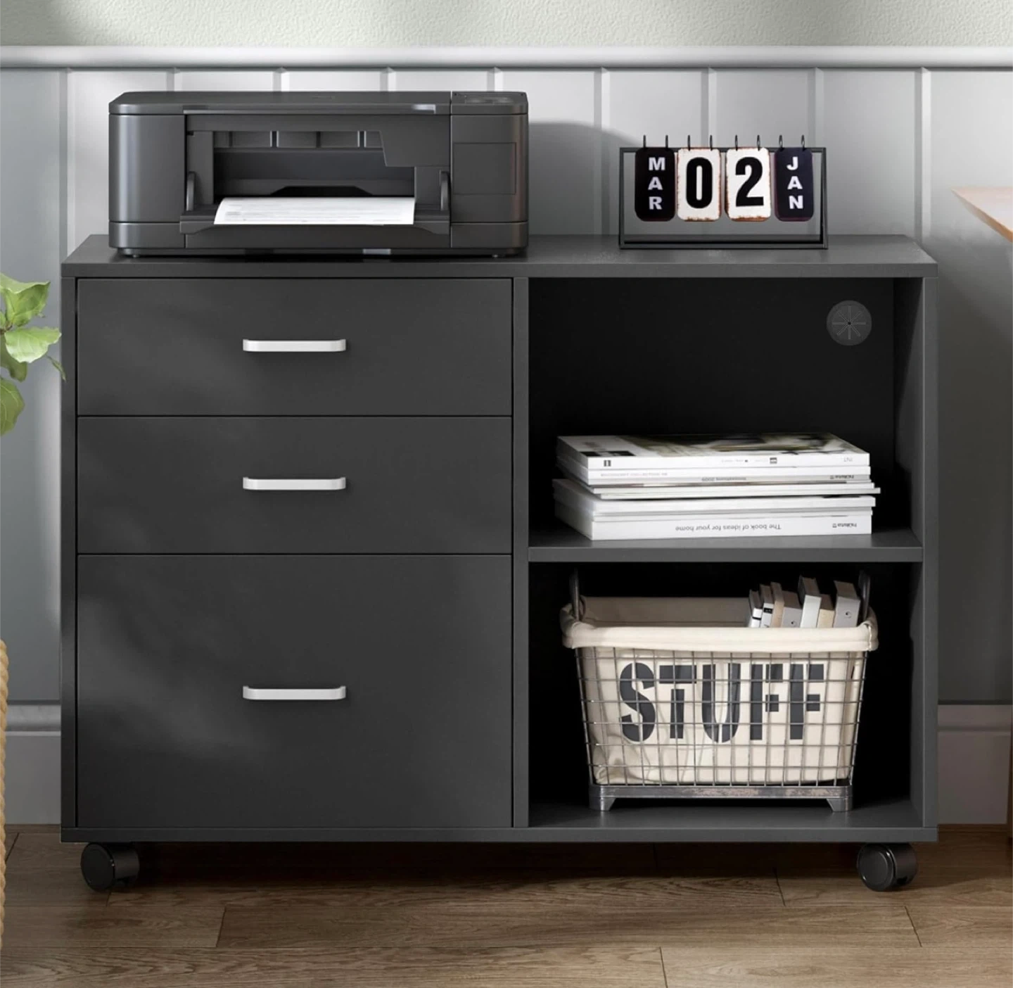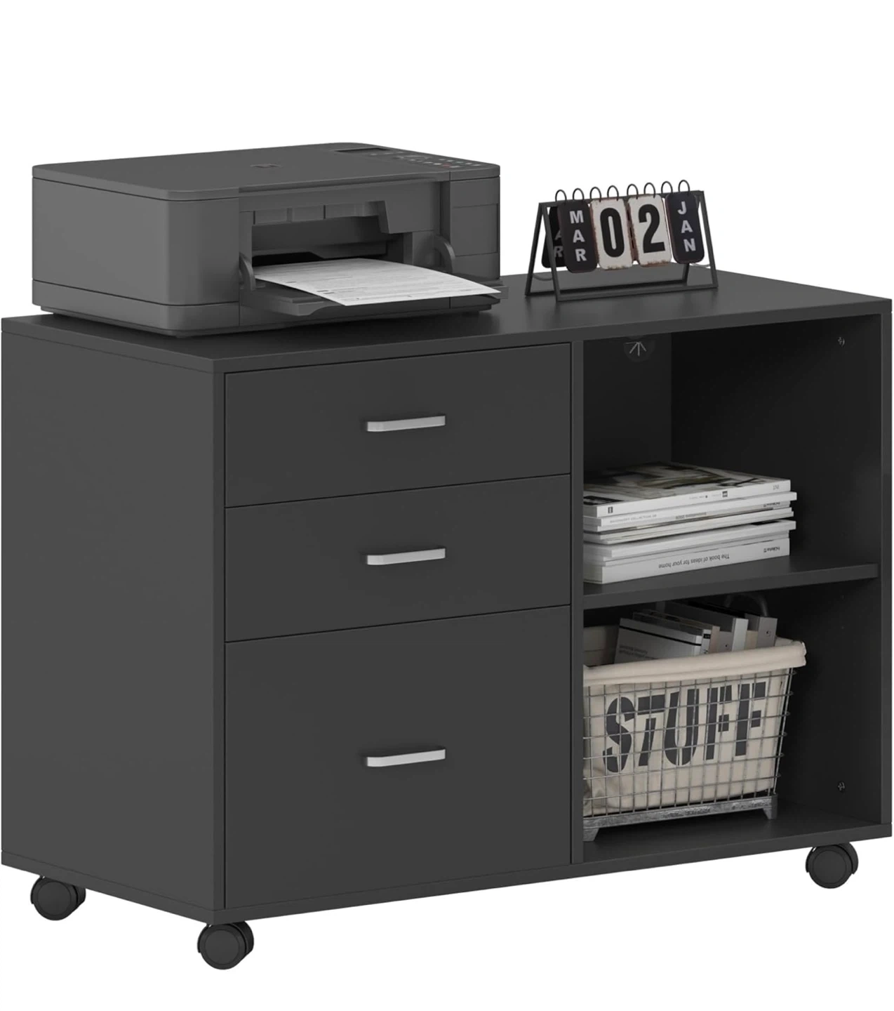 This black file cabinet features three drawers and open storage shelves on the side, perfect for organizing your home office or workspace! It measures approximately 31.3" in length, 15.7" in width, and 24.6" in height.