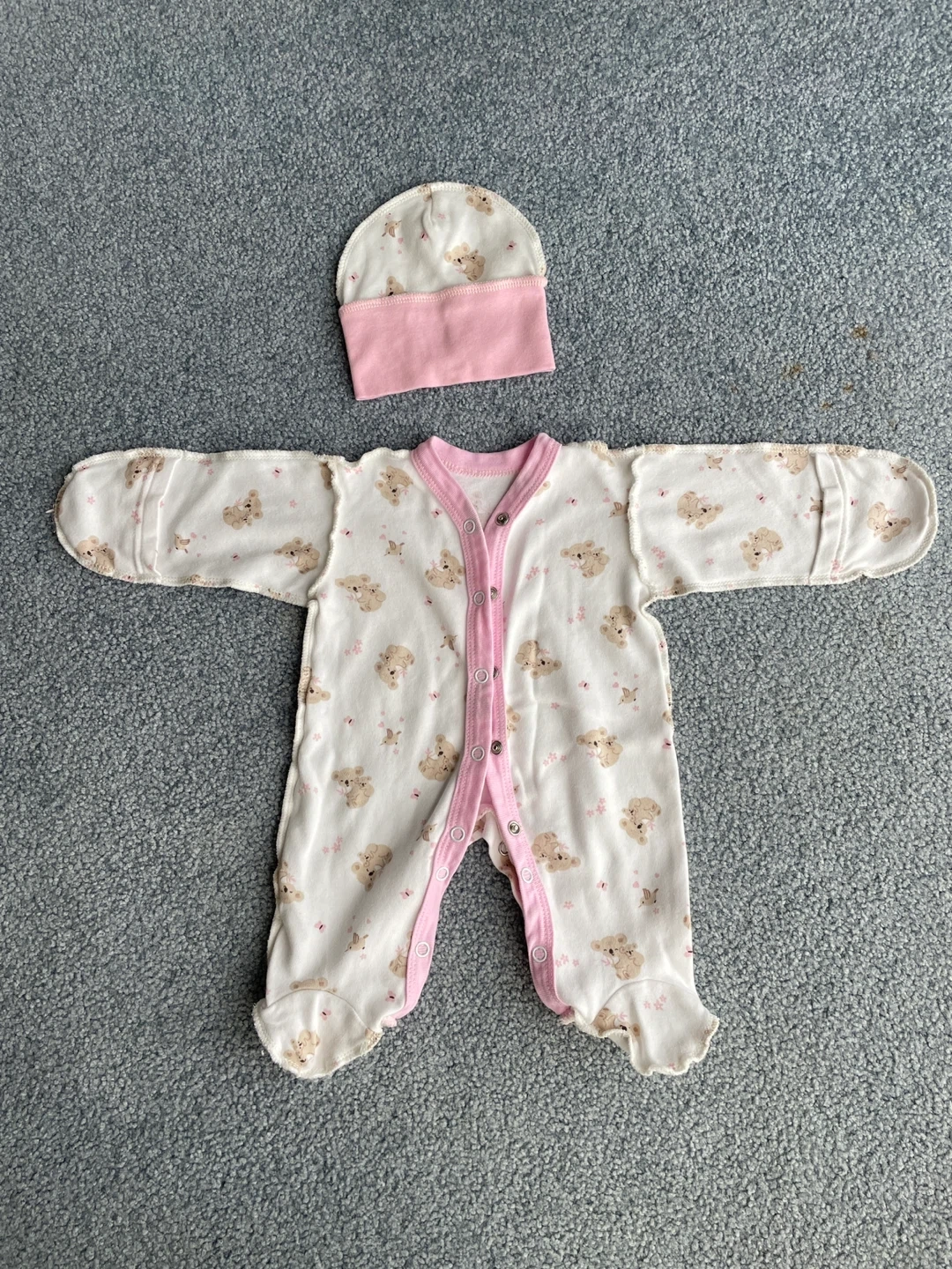Baby girl romper with hat 0-2 months. 100 % cotton, outer seams. It was worn a couple of times.
