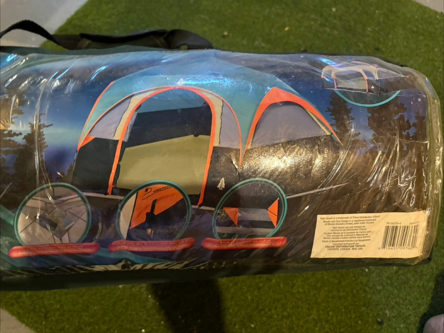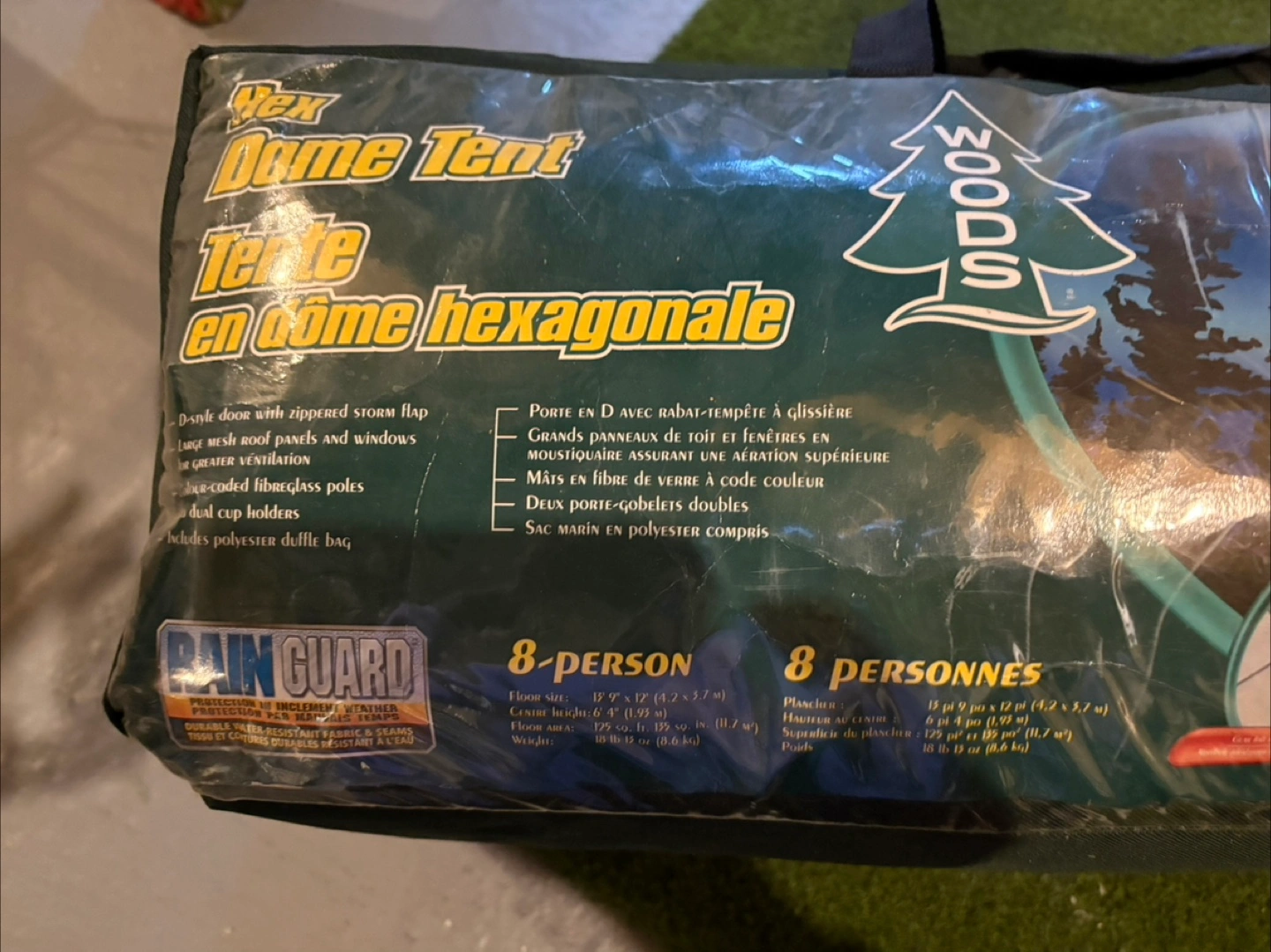 Selling a Woods Hex Dome Tent, perfect for camping with family or friends! It comfortably fits 8 people. The tent features a D-style door with a zippered storm flap, large mesh roof panels and windows for great ventilation, and colour-coded fibreglass poles. It also includes a polyester duffle bag for easy transport. Floor area: 129 sq ft, Centre height: 6'4", Weight: 18 lb 10 oz