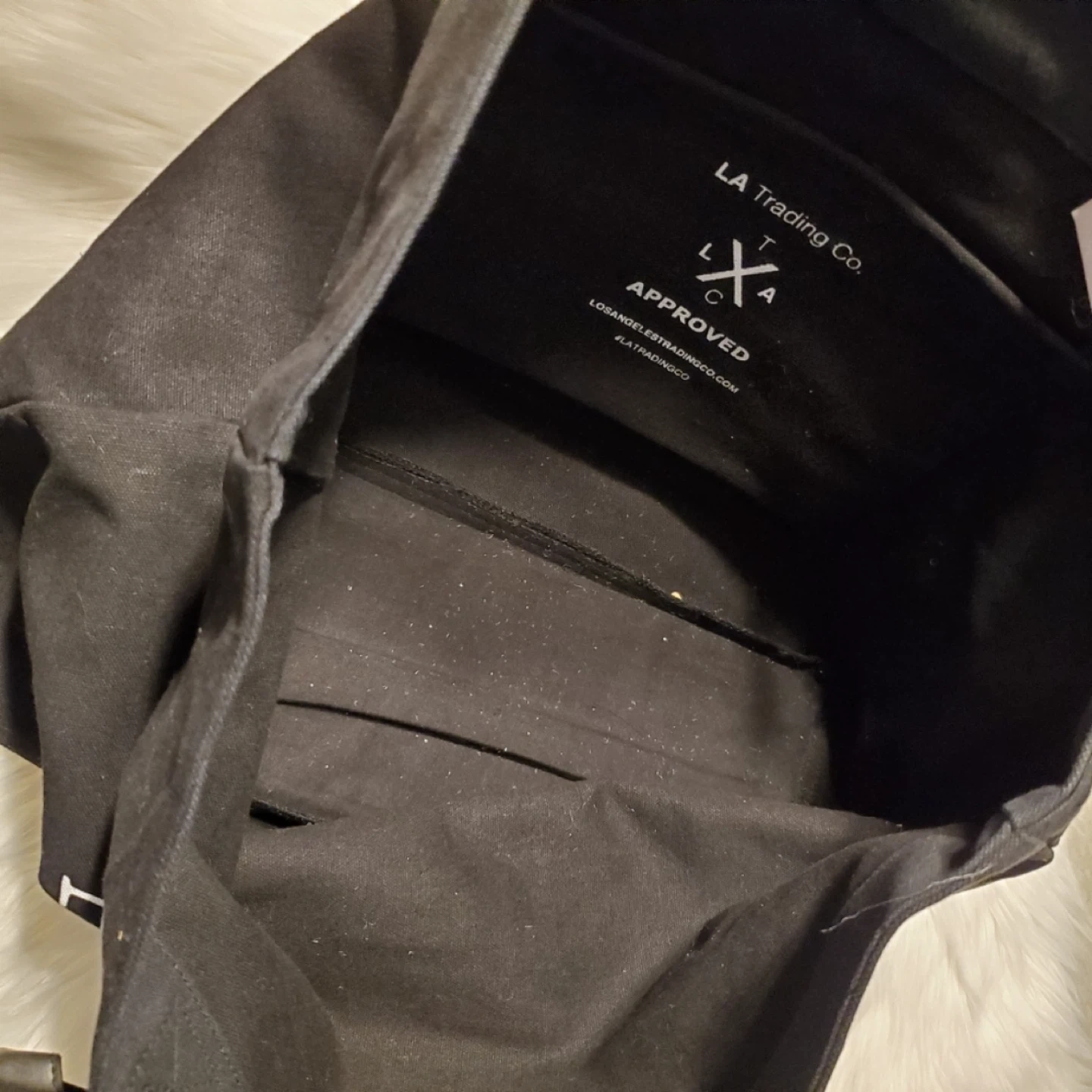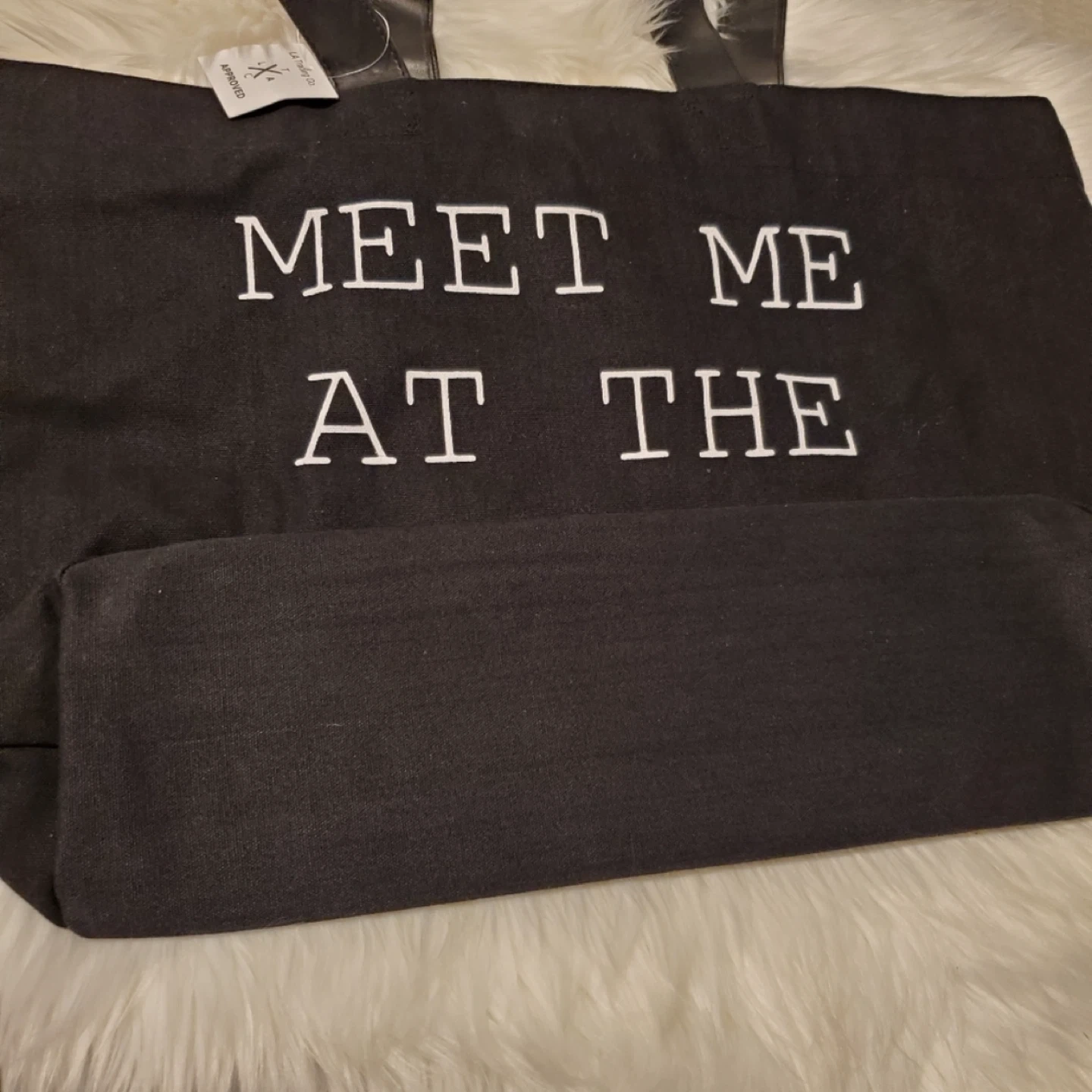 I'm selling a black tote bag from LA Trading Co. It says 'Meet Me at the Coffee Shop' on the front in white lettering. The bag is in good condition and ready for your next coffee run or shopping trip Some minor scuffs on the bag and scratches on the handle Pick up: Suntea on Kingsway Royal Oak skytrain station Metrotown Mall