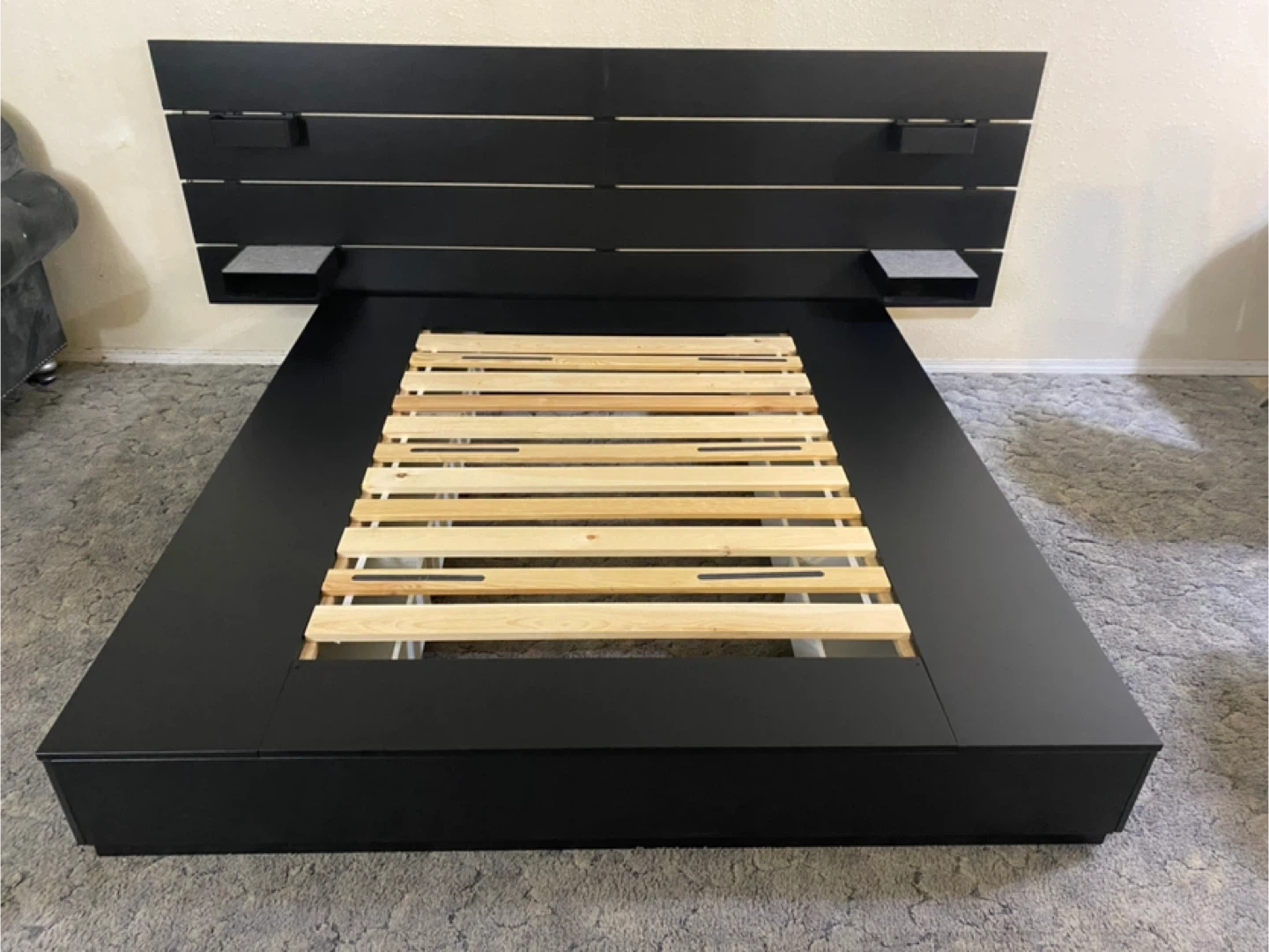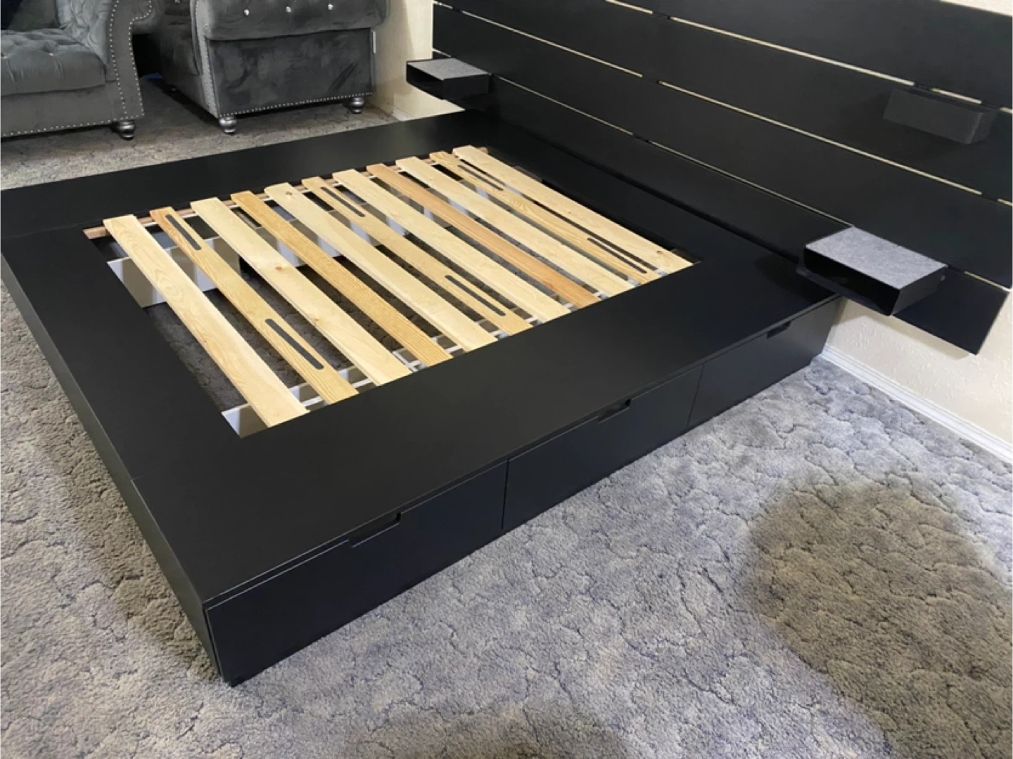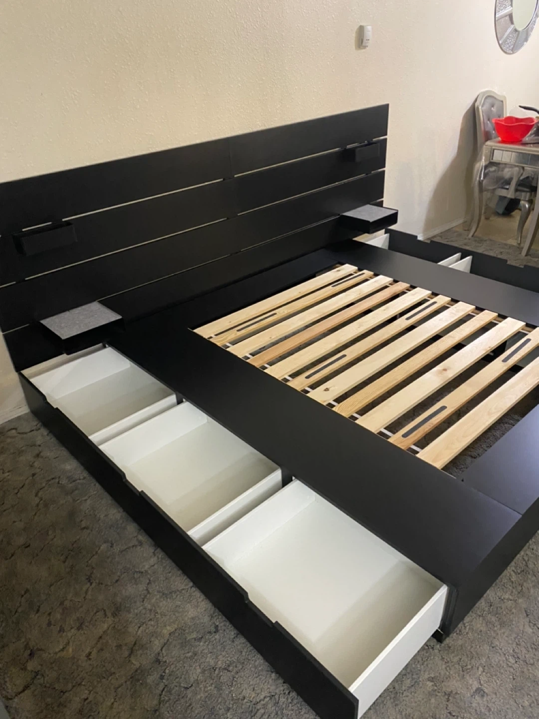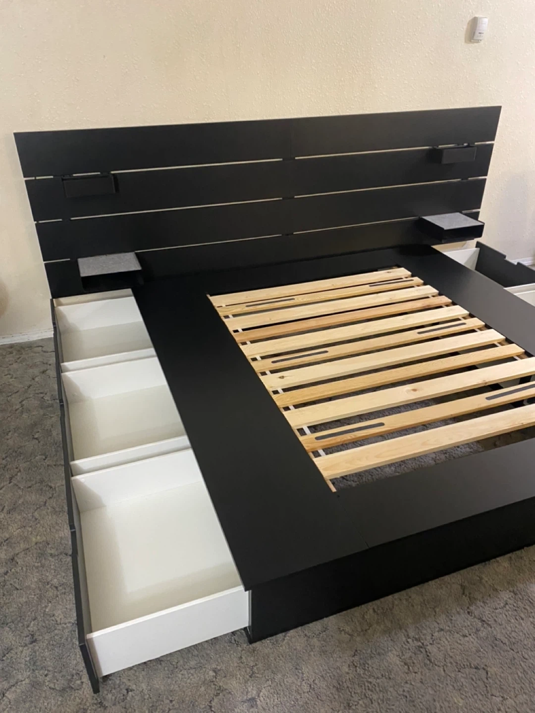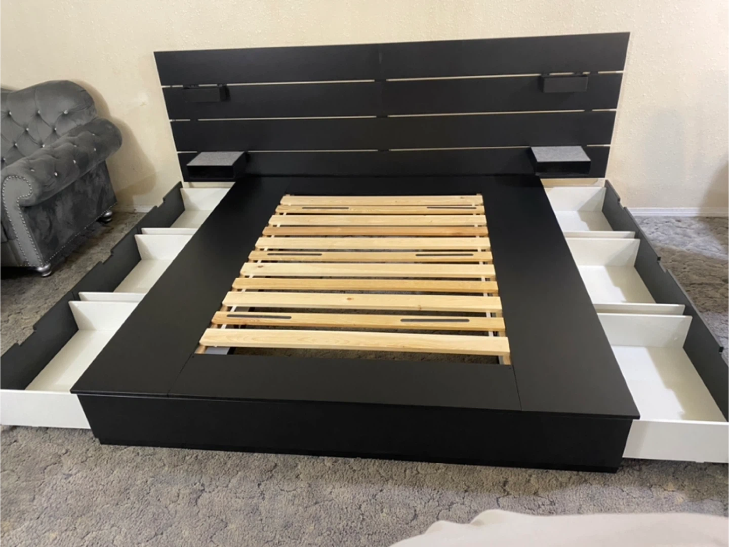 NORDLI king with 6 hydraulic drawers in perfect condition It features a modern headboard with built-in shelves and convenient storage drawers underneath. The bed frame is sturdy and in great condition, ready to add a stylish touch to your bedroom!pick up near surrey centre station or can deliver for extra .smoke and pet free.