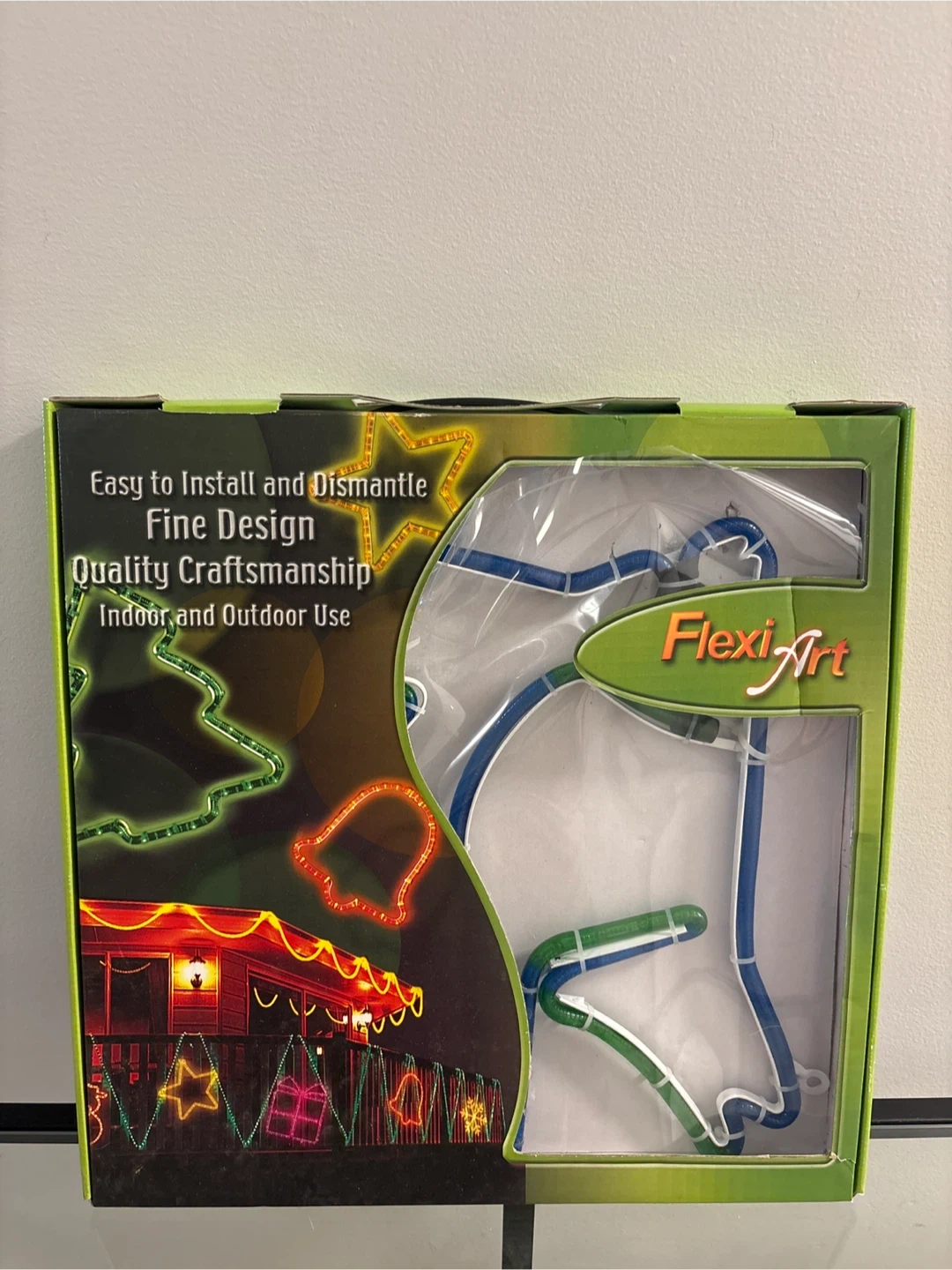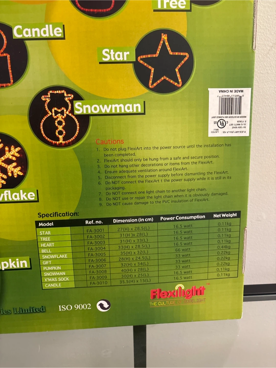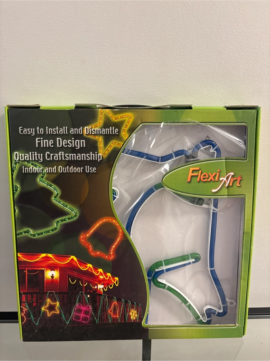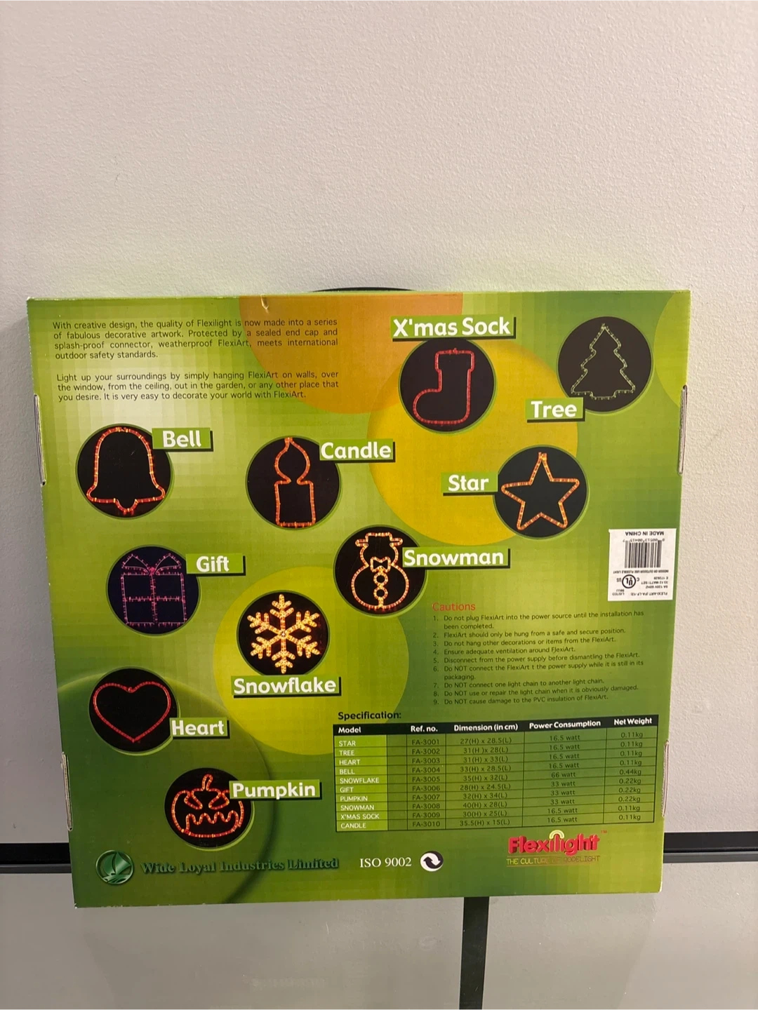 Get ready to light up your surroundings with these FlexiArt LED light decorations! They are easy to install and dismantle with a fine design and quality craftsmanship. Suitable for both indoor and outdoor use. The box includes various shapes like a bell, candle, star, snowman, and more