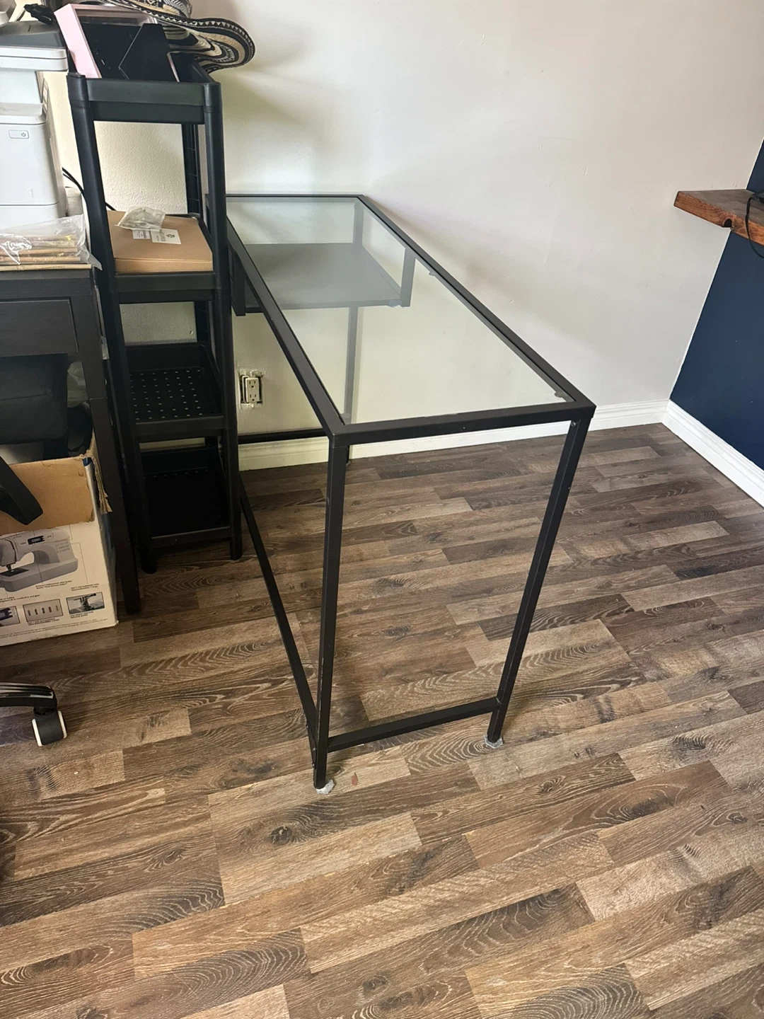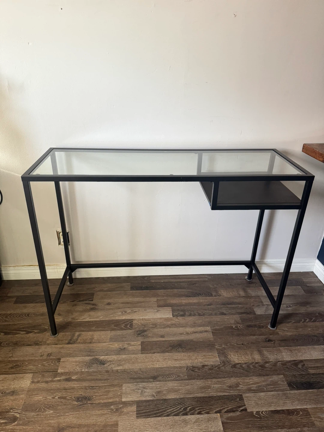 Selling a desk with a glass top and black metal frame! It's in great shape and would be perfect for a home office or study space. It on the small size of it will also be great as a console or entry way.