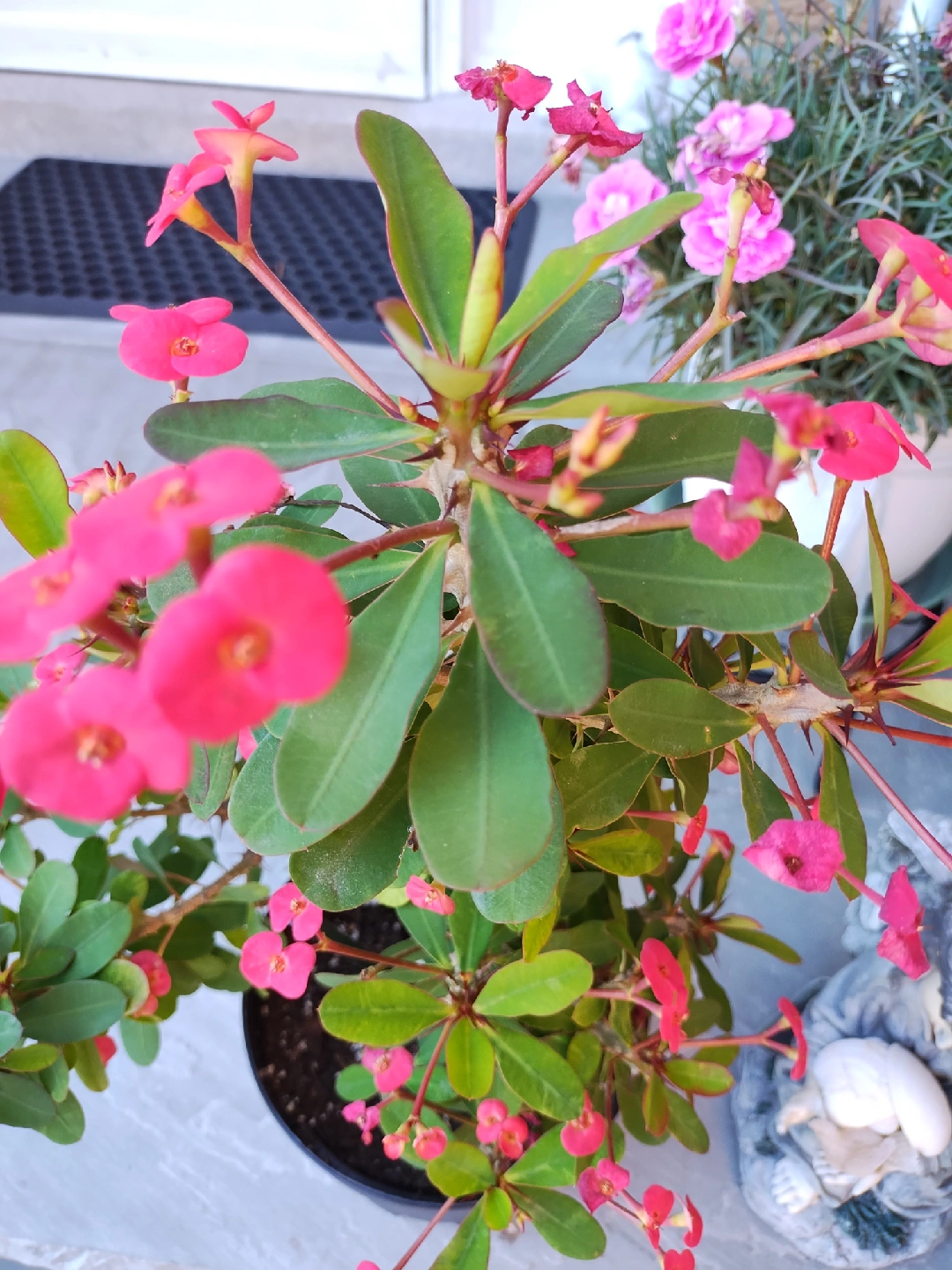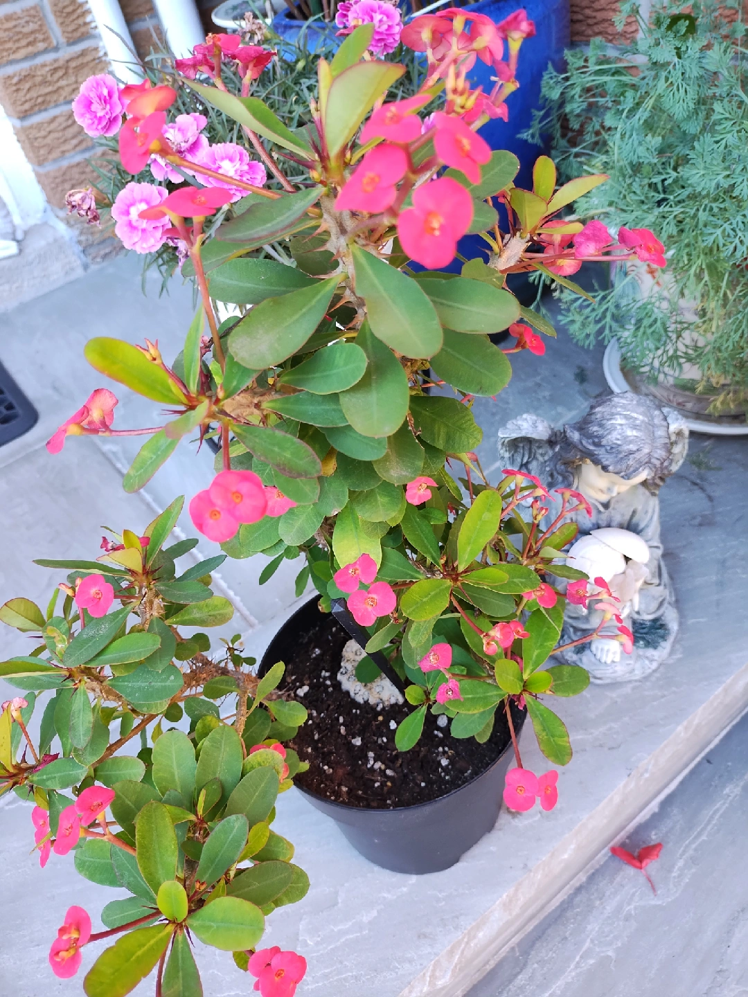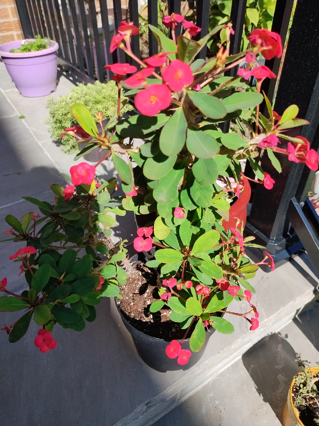 Vibrant Crown of Thorn Cactus continuous display of bright red flowers and drought tolerant nature. Healthy and mature growing easy care beautiful flowering cactus plant.