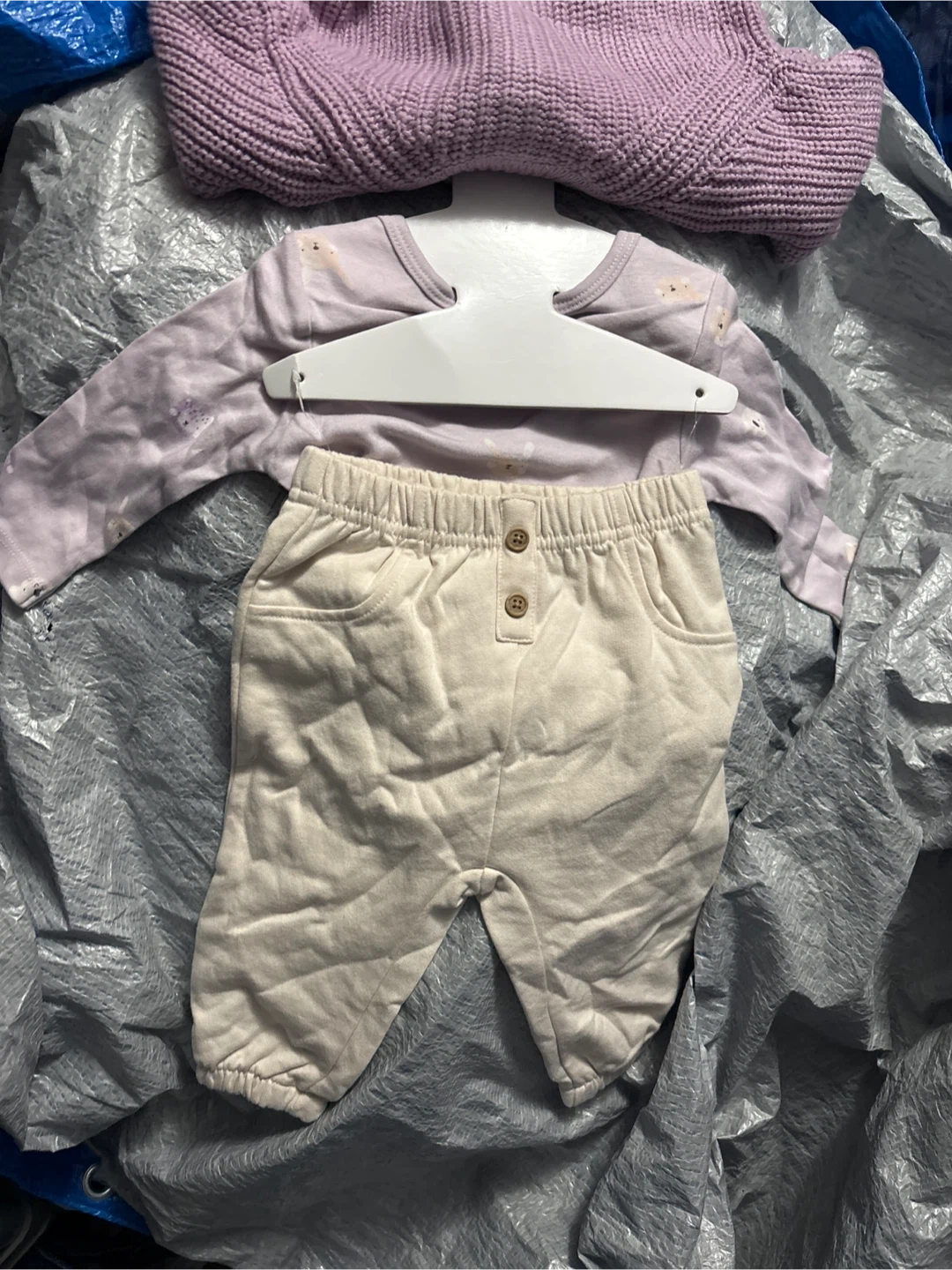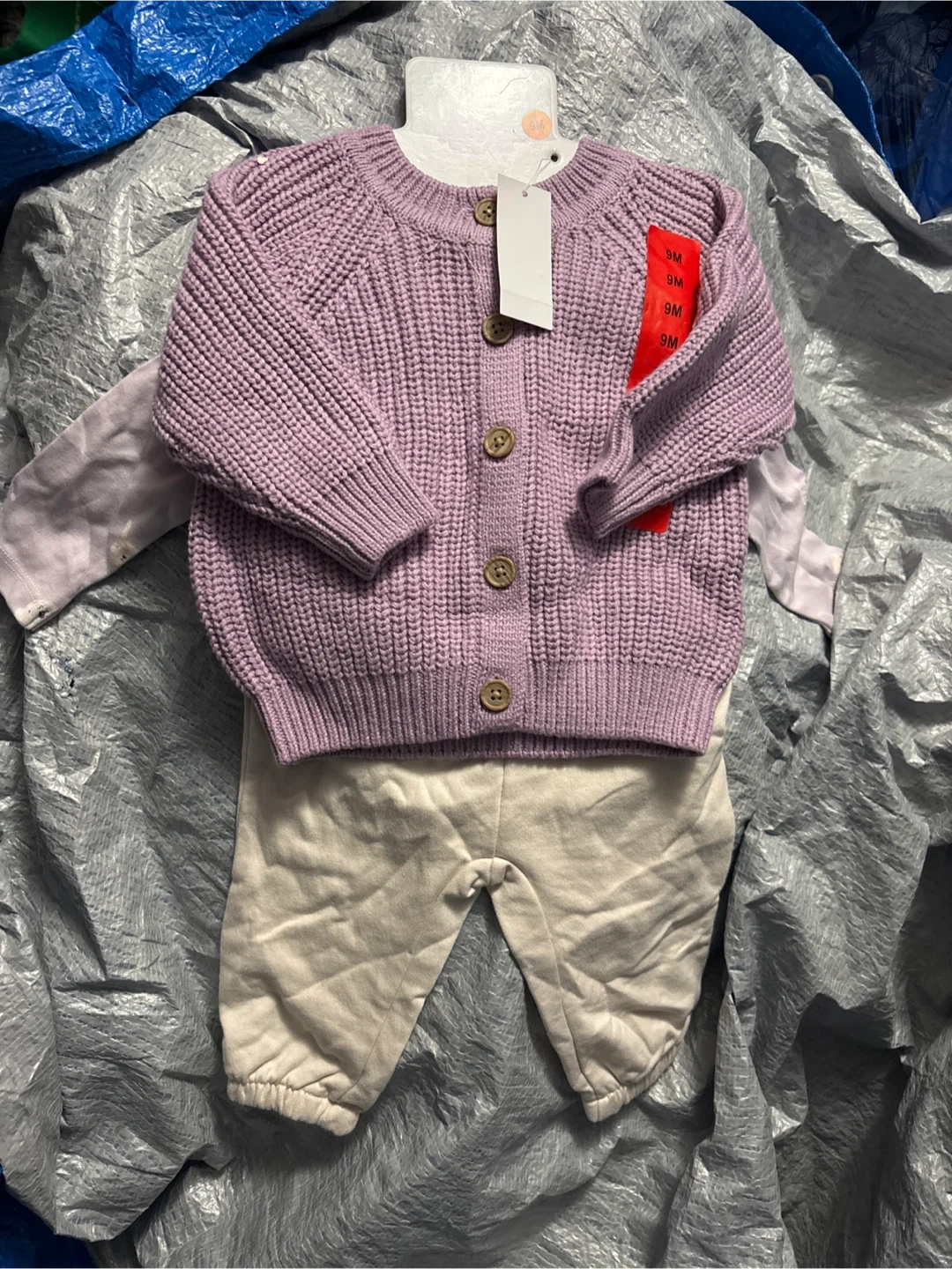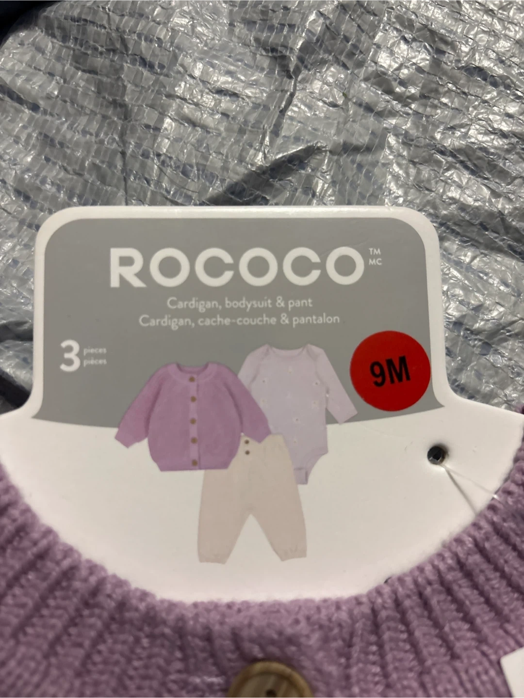A super cute Rococo baby outfit set in size 9M! This set includes a cardigan, bodysuit, and pants. Perfect for your little one! 9M