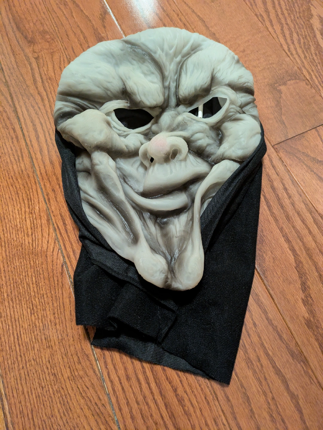 Selling a grey Halloween mask with a black fabric piece attached. It's in good condition and ready to scare!