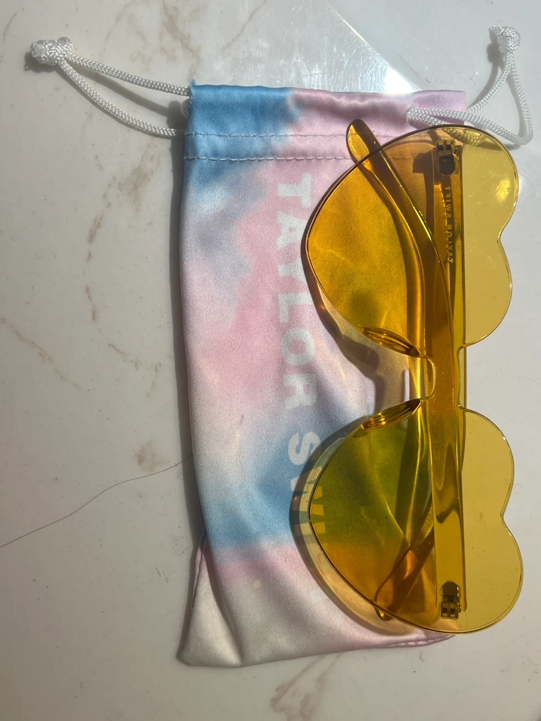 Bought in 2020 Taylor Swift website online, only wore one for taking a photo, still comes with the original bag. Selling a pair of super cute yellow heart-shaped sunglasses! They come with a drawstring bag, perfect for keeping them safe and scratch-free. Add a pop of fun to any outfit with these sunnies