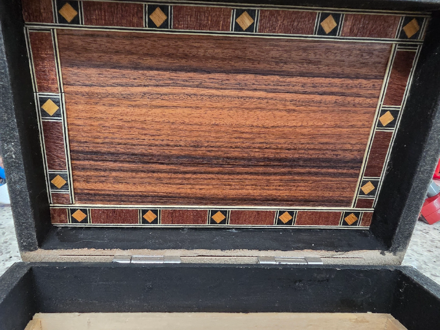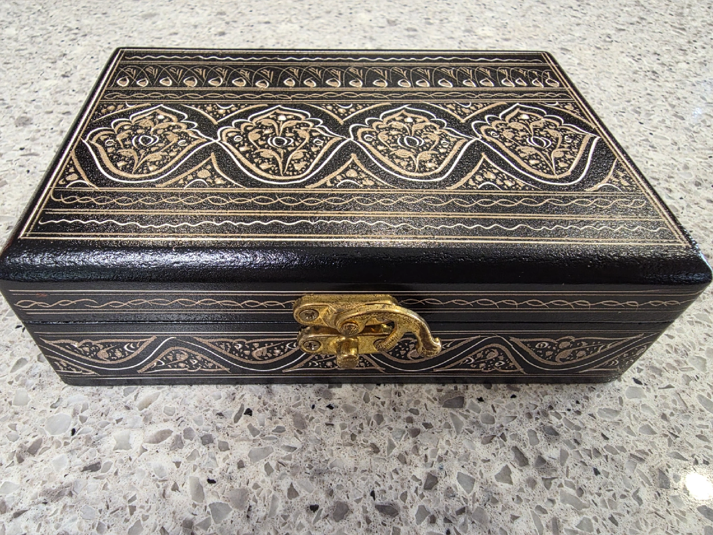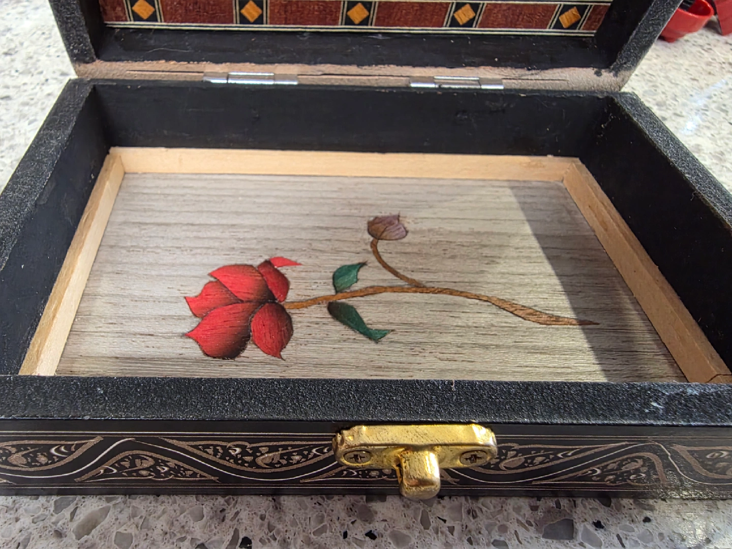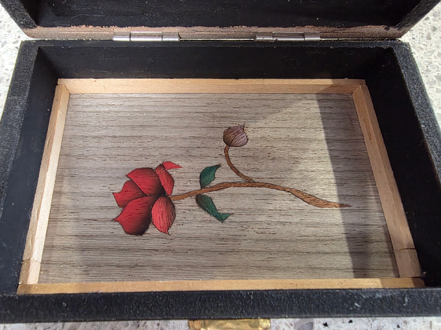 Selling a lovely decorative wooden box. It features intricate detailing on the exterior and a beautiful rose inlay on the inside. Perfect for storing jewelry or other small treasures!