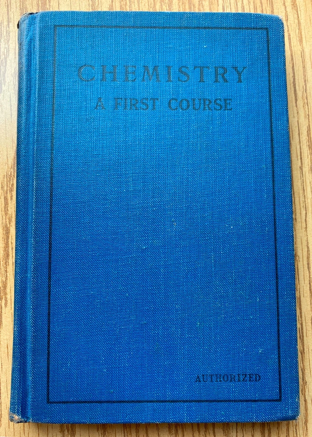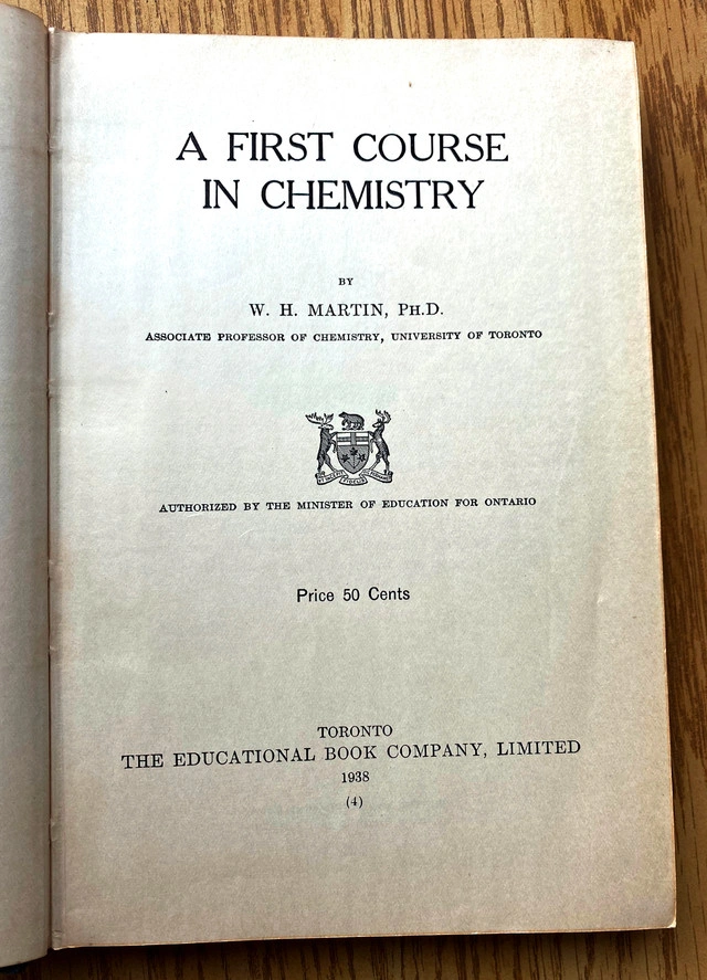 Antique Book: A First Course in Chemistry hardcover by W.H. Martins Publisher: The Educational Book Company Toronto 1938 Selling price: $25 Condition: Used - Good For Sale By: Owner Curbside pick up: Yes Cash accepted: Yes, Cashless payment