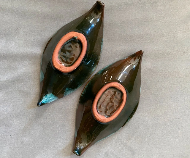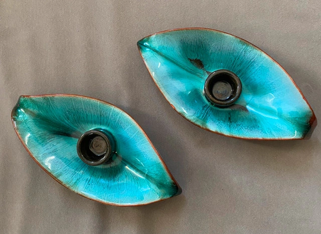 Two Vintage Blue Ceramic Candle-holders tree leaf shaped 6 inches long in very good condition. Selling price; $20