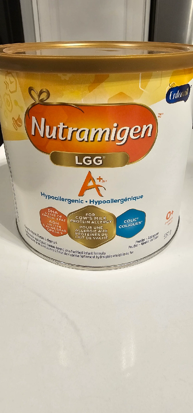 Selling a can of Enfamil Nutramigen A+ hypoallergenic infant formula. It's designed for babies with cow's milk protein allergy and colic. Contains DHA, a type of Omega-3 fat, and ADH. Powder form, just add water. Net weight: 561g