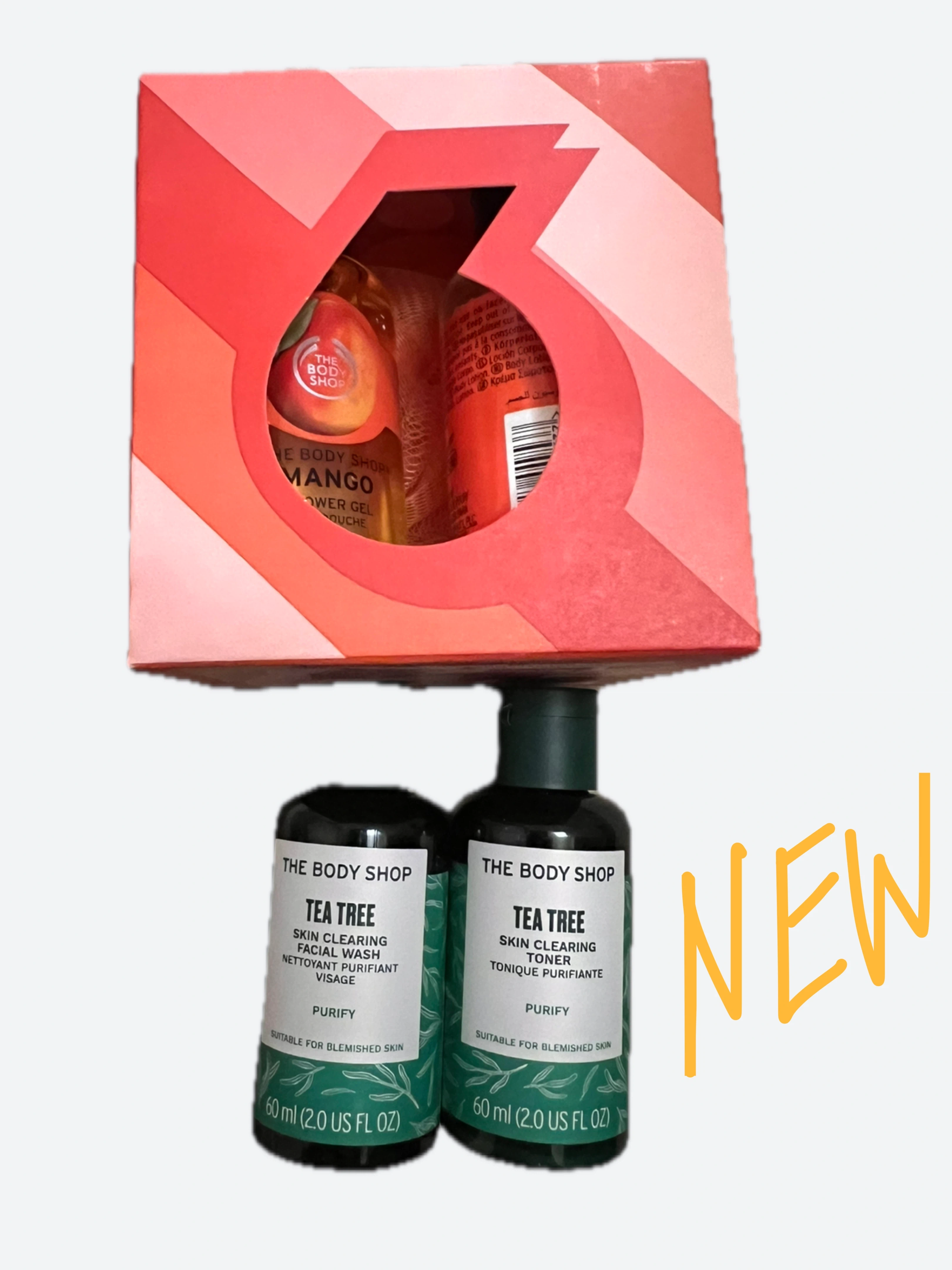 I have a brand new The Body Shop Tea Tree set and mango set for sale all four items together for $18! This set includes a skin-clearing facial wash and toner, both perfect for blemish-prone skin. The mango set has shower gel and body lotion