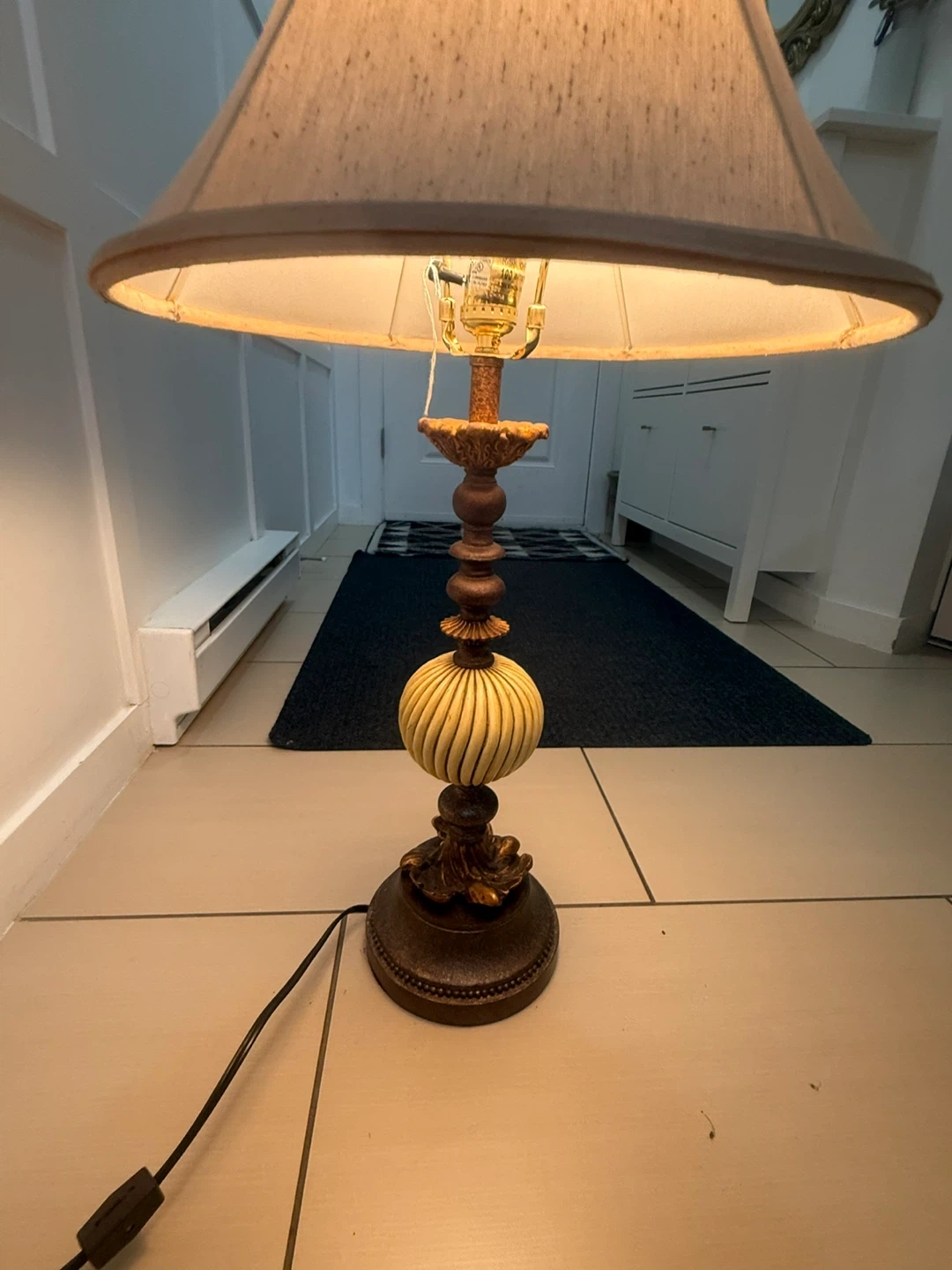 Selling a charming vintage-style table lamp. It features a decorative base and a neutral-toned lampshade that would complement any room. It's in great condition and ready to brighten up your space!