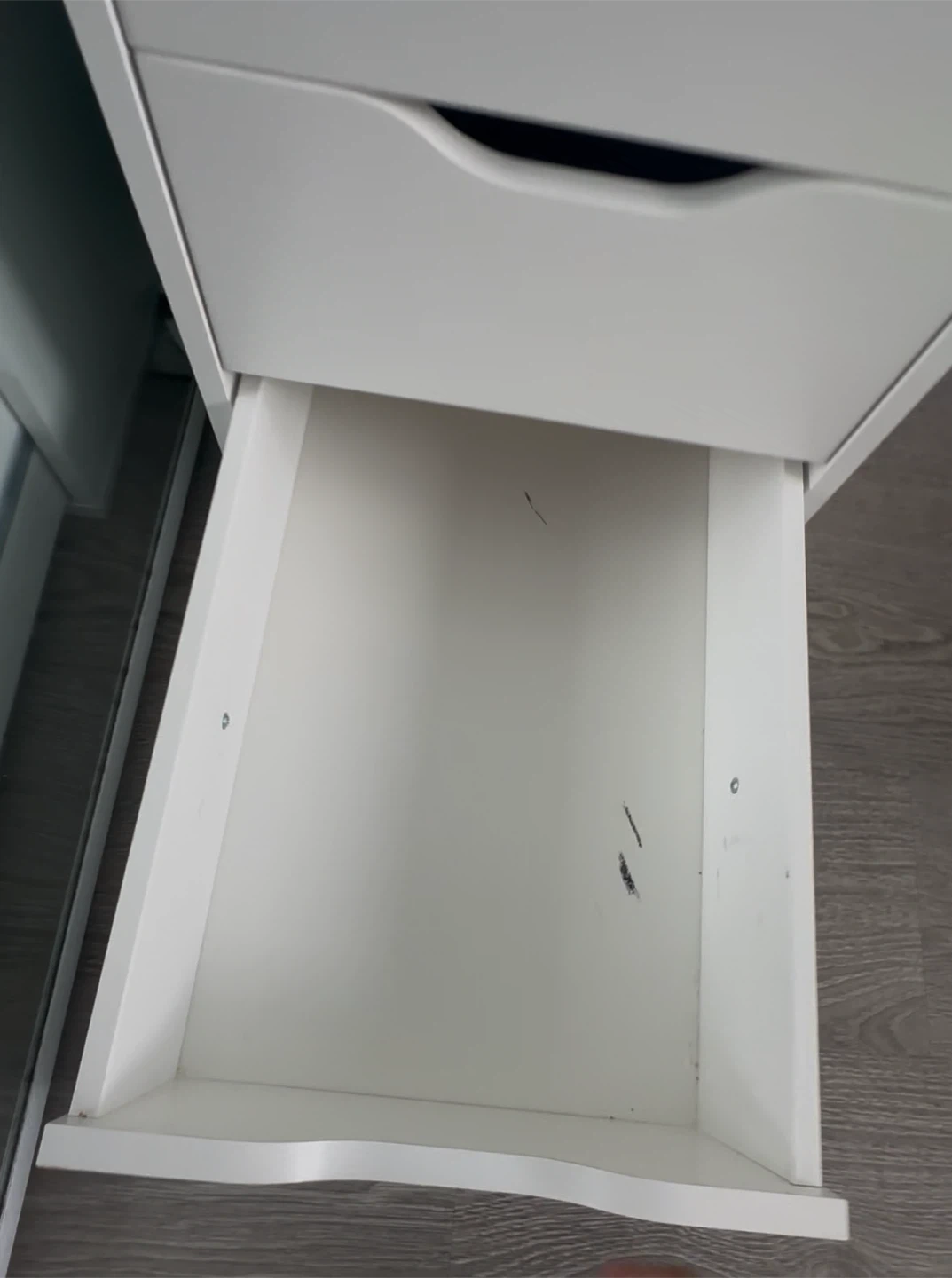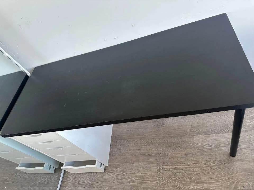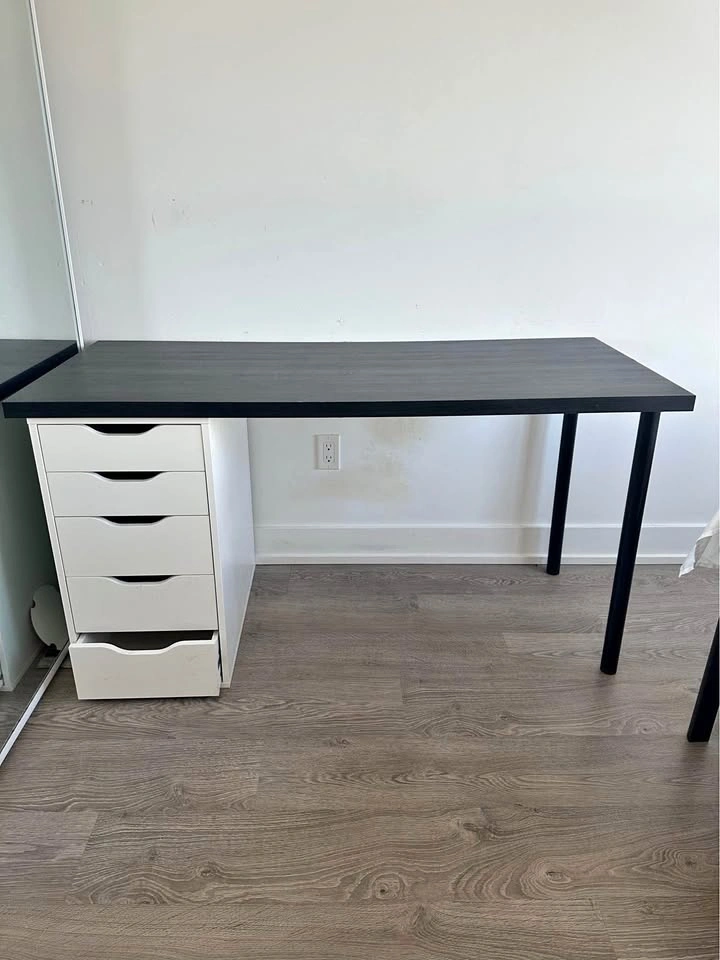Purchased this desk with a black-brown tabletop and a white drawer unit for $190 from IKEA. Also has a wire holder/organizer attached to the bottom as shown. The bottom drawer has a black marker stain, apart from that there’s no other damages. I can share a video of the product upon request The tabletop, legs and drawer unit can be detached, measurements are given in the ad photos. Looking for someone to take it off my hands ASAP since I’m moving soon but pls don’t lowball. Pickup location is near Islington station. Check out my other listings for items on sale!