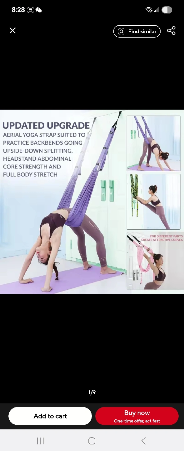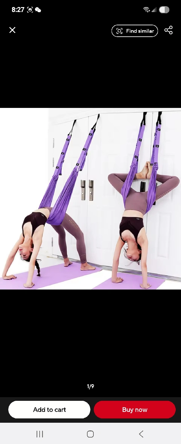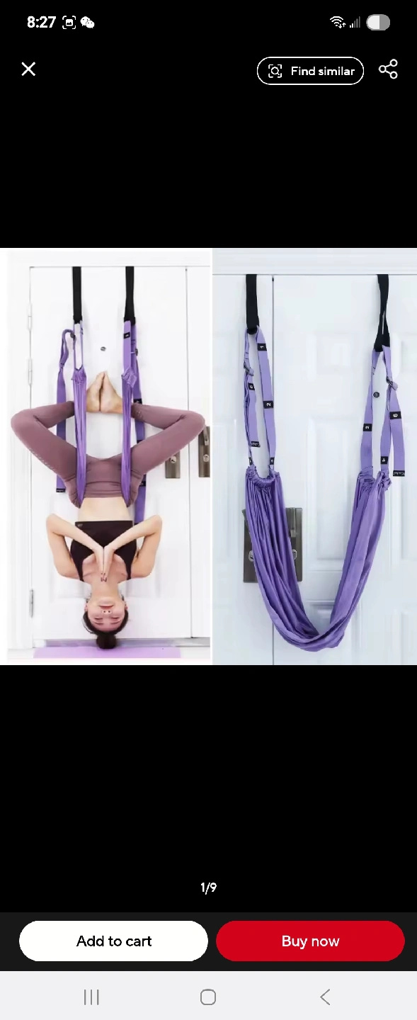 Get your yoga on with this aerial yoga swing set! It's a great way to practice backbends, upside-down splits, headstands, abdominal core strength, and full body stretches. The set is purple and appears to be in great condition. Perfect for anyone looking to add a new dimension to their yoga practice!