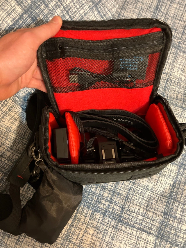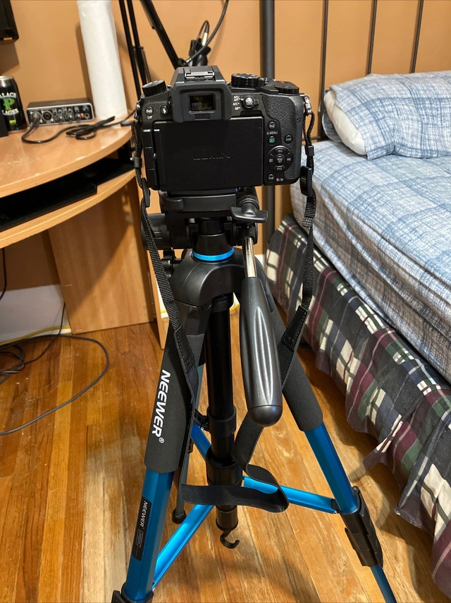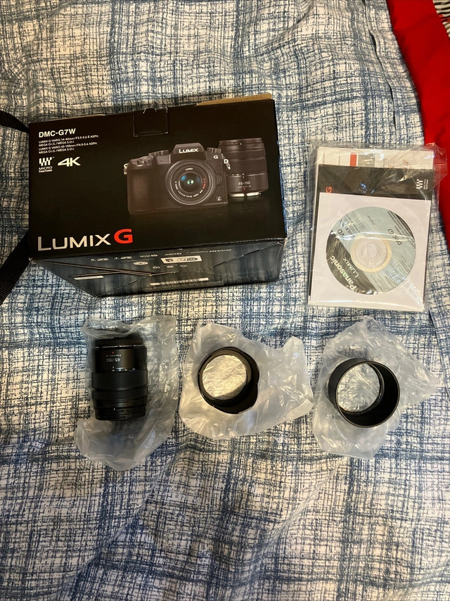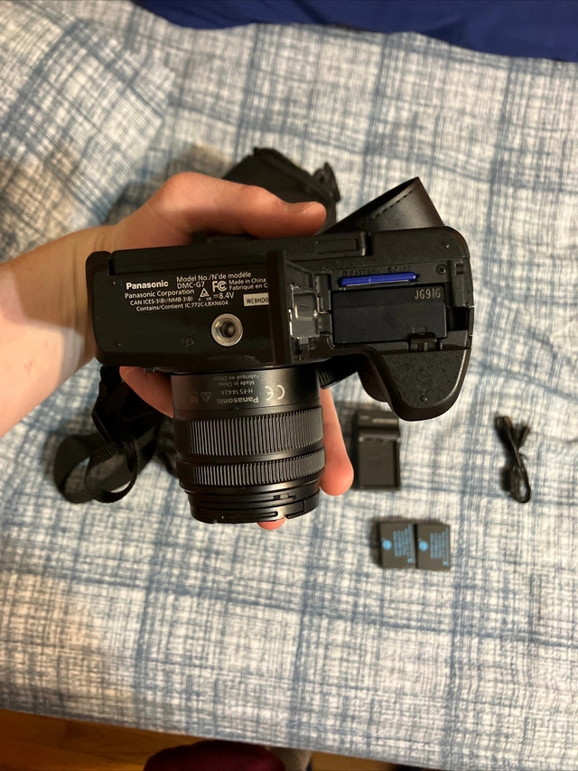 This listing comes with everything you see in the pictures: the camera with box/everything that came in box, bag for the camera, 3 batteries, charger for the batteries, 32GB SD Card, 3.5 jack lavalier mic, Neewer tripod, and bag for the tripod.