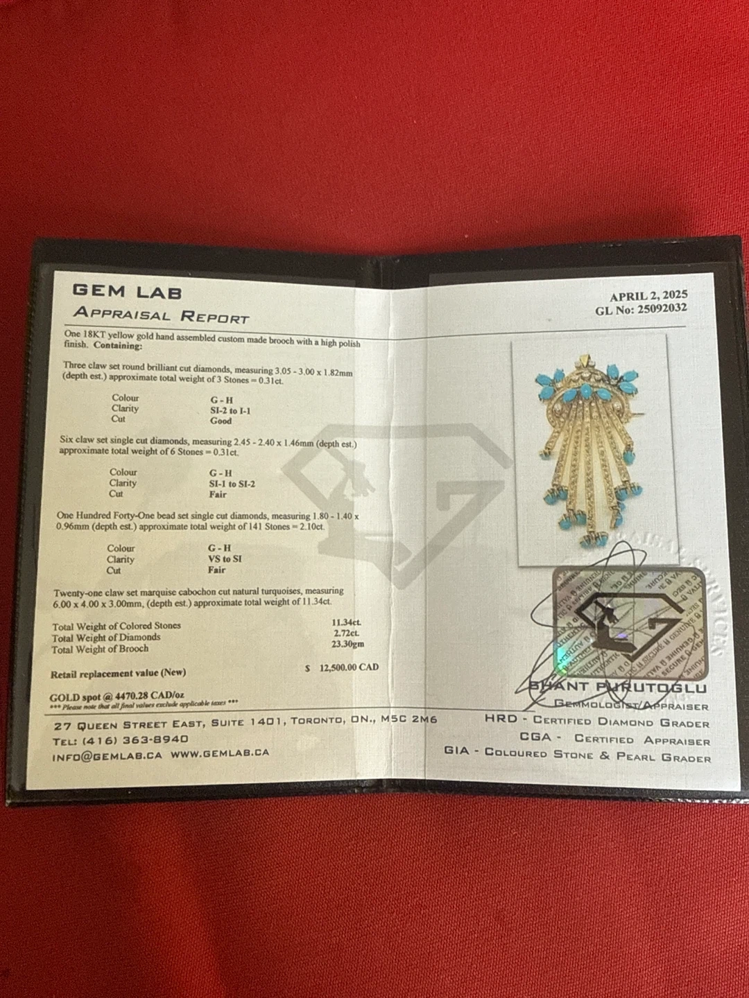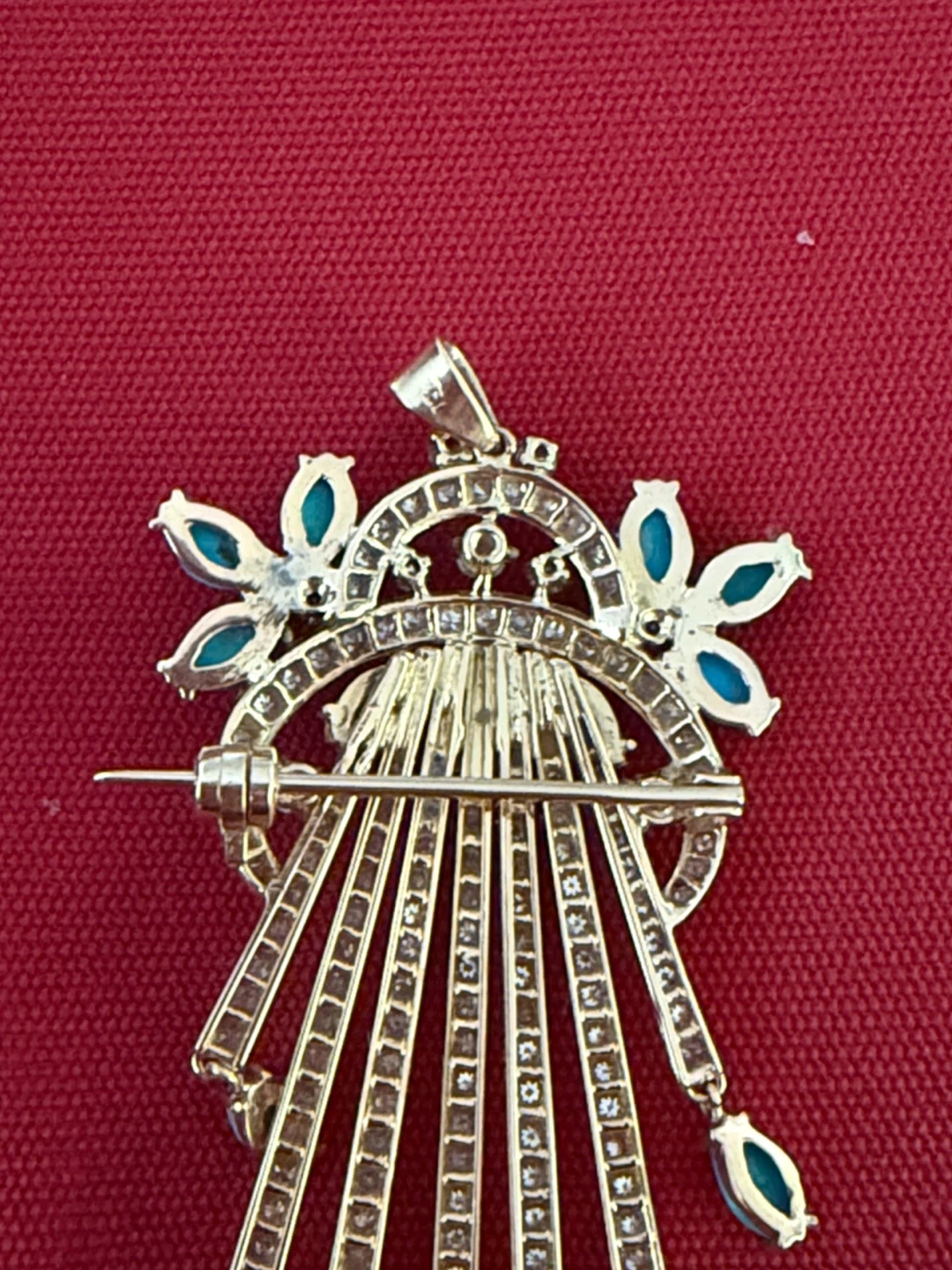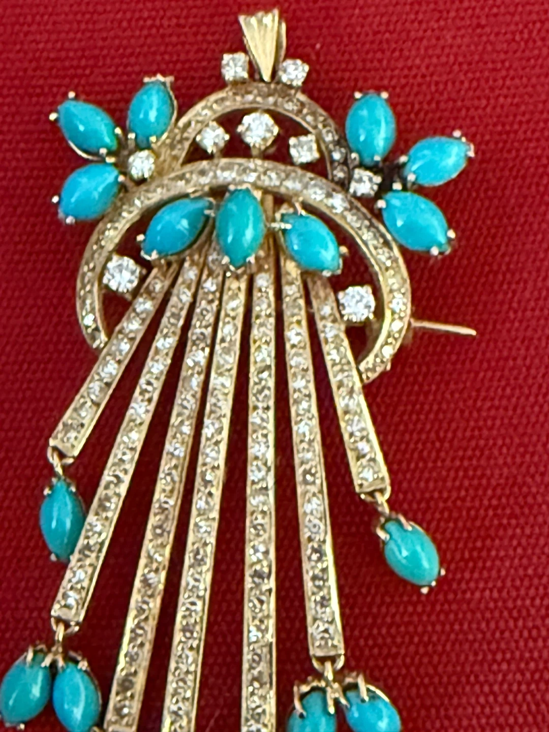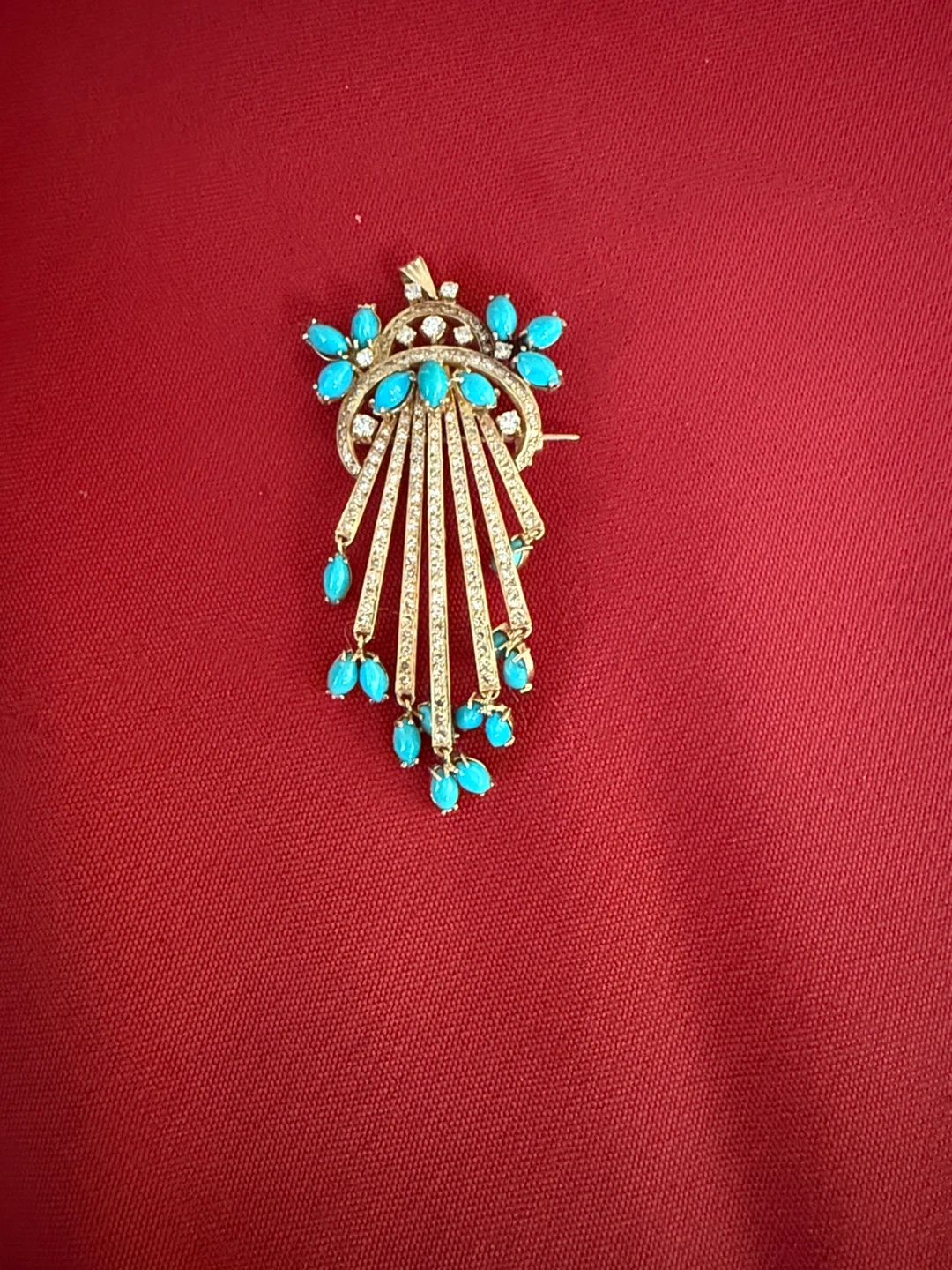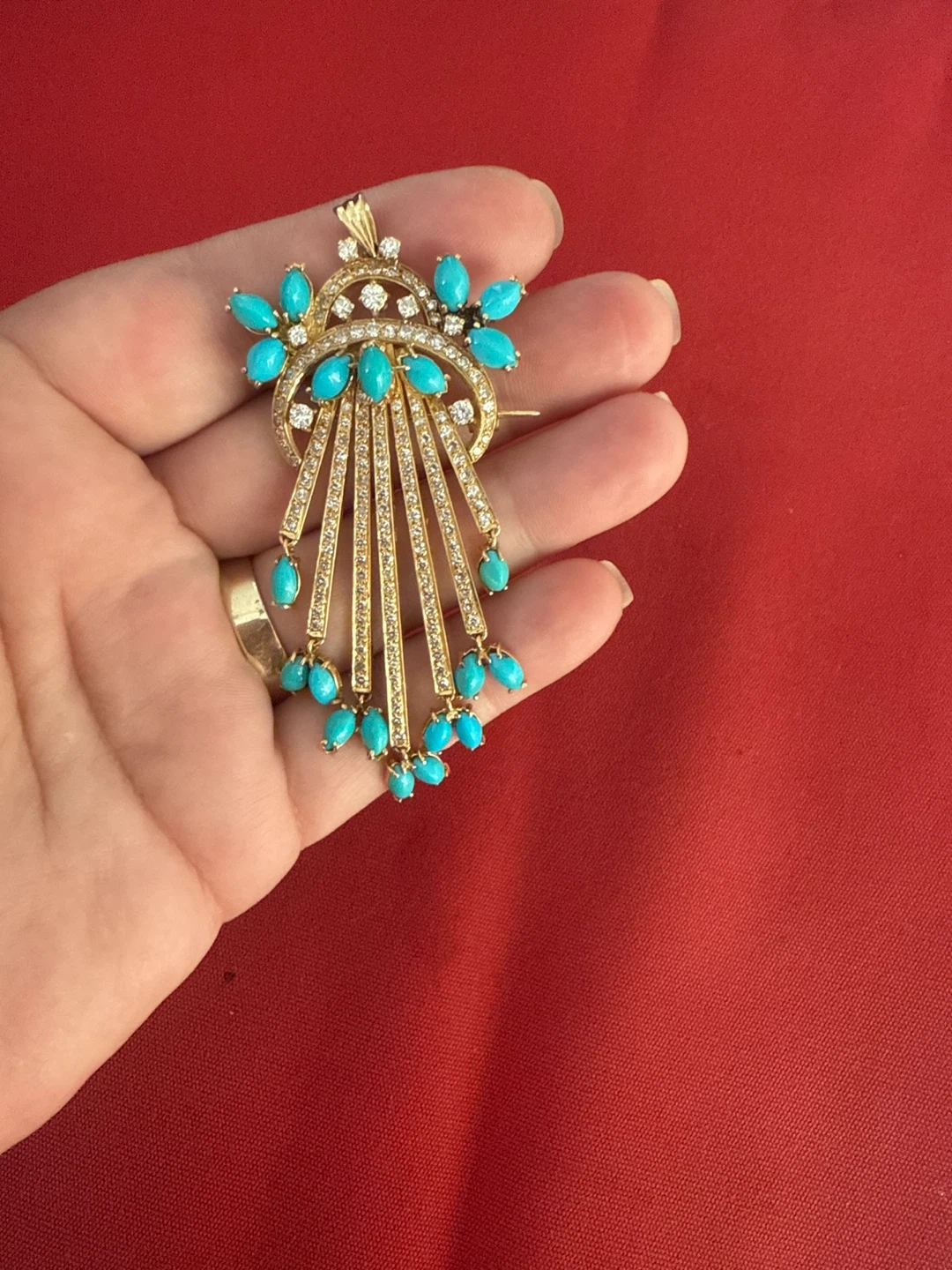 Selling a vintage 18k solid gold brooch/pendant featuring beautiful sleeping beauty turquoise accents. This unique piece would make a lovely addition to any jewelry collection or a special gift for someone who appreciates vintage style. Pendant is appraised for $12000 Serious buyers only.