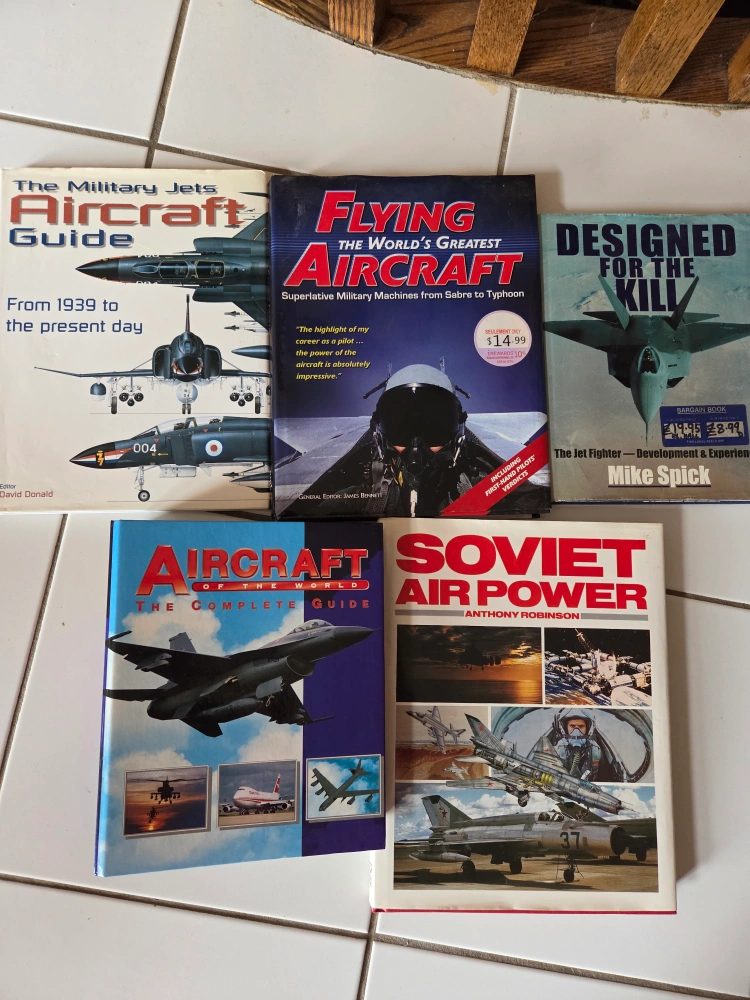 5 books about aircraft and fighter jets. Perfect gift for someone who doesn't mind second hand books. If you can see them then they are available..no need to ask if they are available.