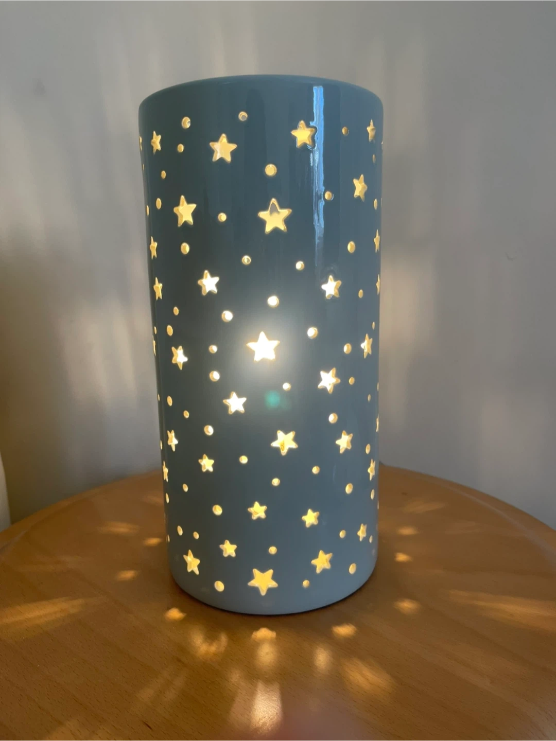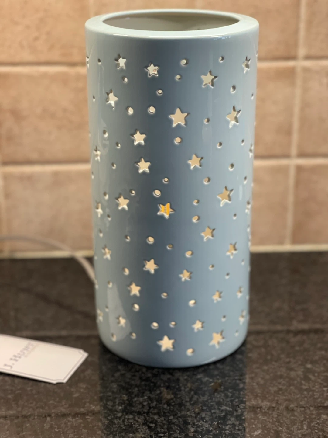 Add a touch of magic to any room with this J. Hunt Home Starry Night light! It's in great condition and casts a lovely, warm glow thanks to the star-shaped cutouts. Perfect for a bedside table or as a decorative accent in your living space