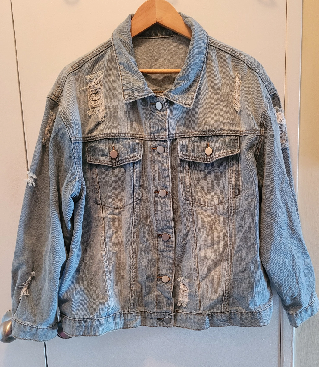 Here's a stylish distressed denim jacket that's perfect for adding a bit of edge to any outfit! It's in great condition and ready for a new home. The jacket features a classic denim look with a modern, distressed design.
