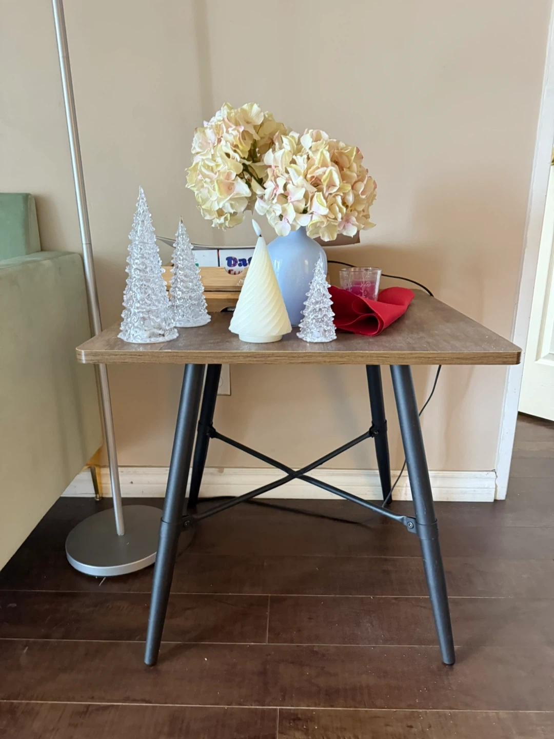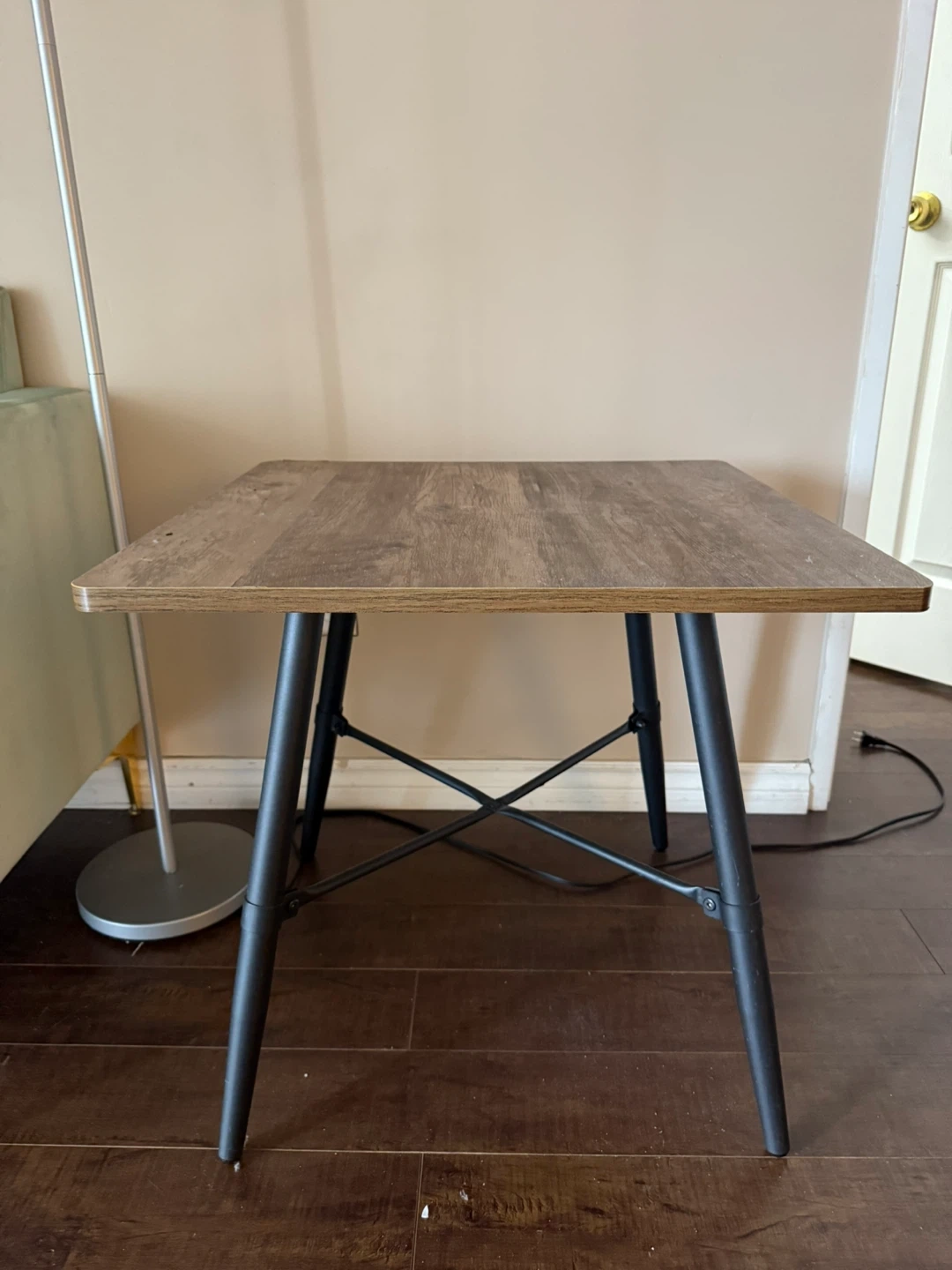 A cute wood grain side table with black metal legs! Perfect for a small space or as an accent piece in your living room or bedroom. It's in great shape and ready for a new home
