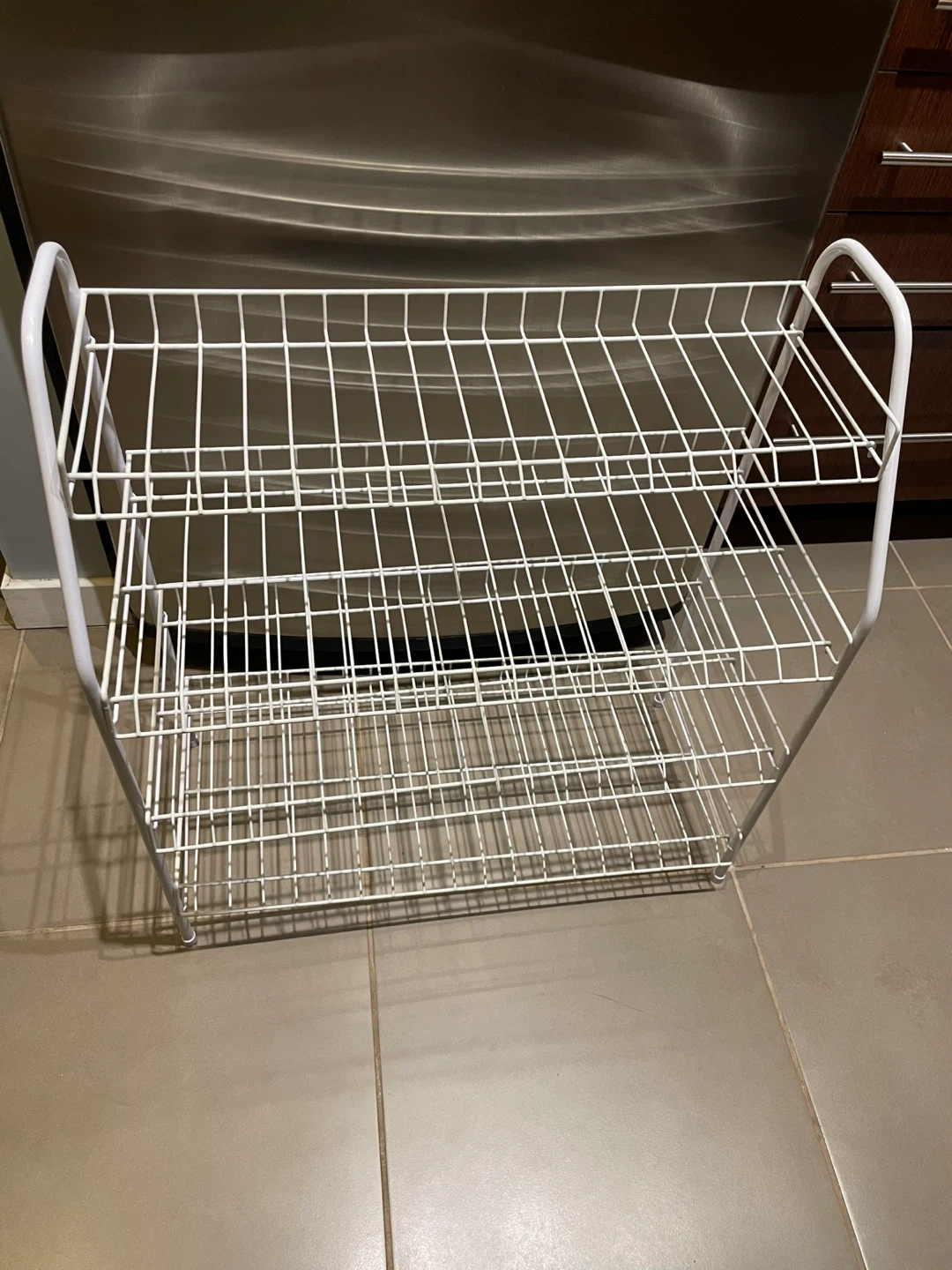 Here's a handy 3-tier shoe rack to keep your entryway organized! It's made of sturdy white wire and is in great shape. Perfect for keeping your shoes tidy and off the floor. It's a simple and practical solution for shoe storage