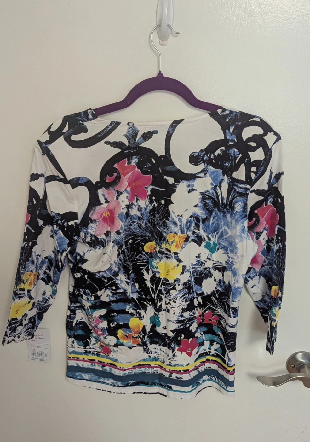 It features a beautiful floral pattern with various colours. The cardigan has a button-up front and 3/4 sleeves. Originally bought for $39.95!
