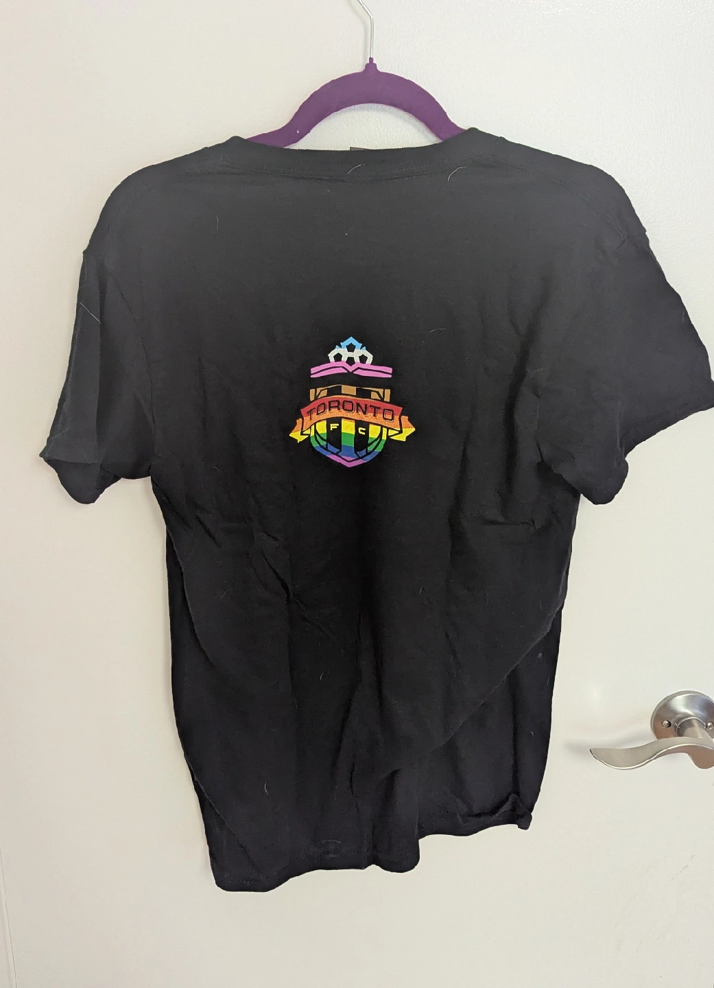 Selling a black Toronto FC pride t-shirt in size small. The shirt features a colourful design with the words 'LOVE ALL HATE NONE'. It's made of 100% cotton and is in new condition!