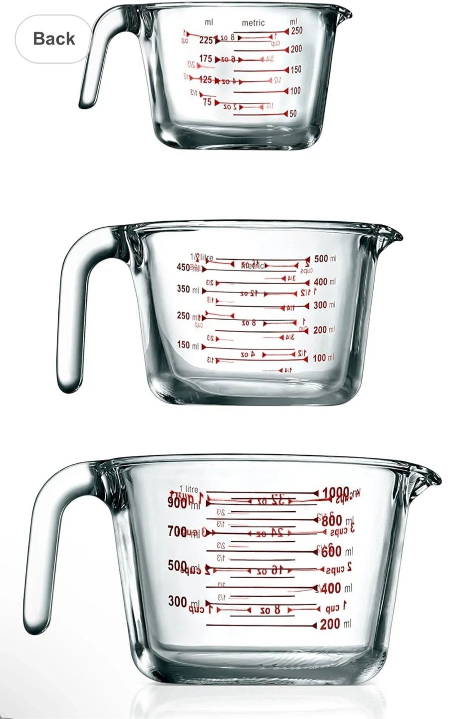 I have a set of three glass measuring cups. They range in size from small to large, perfect for all your baking and cooking needs! The measurements are clearly marked in both millilitres and cups. They're in great condition and ready for a new home