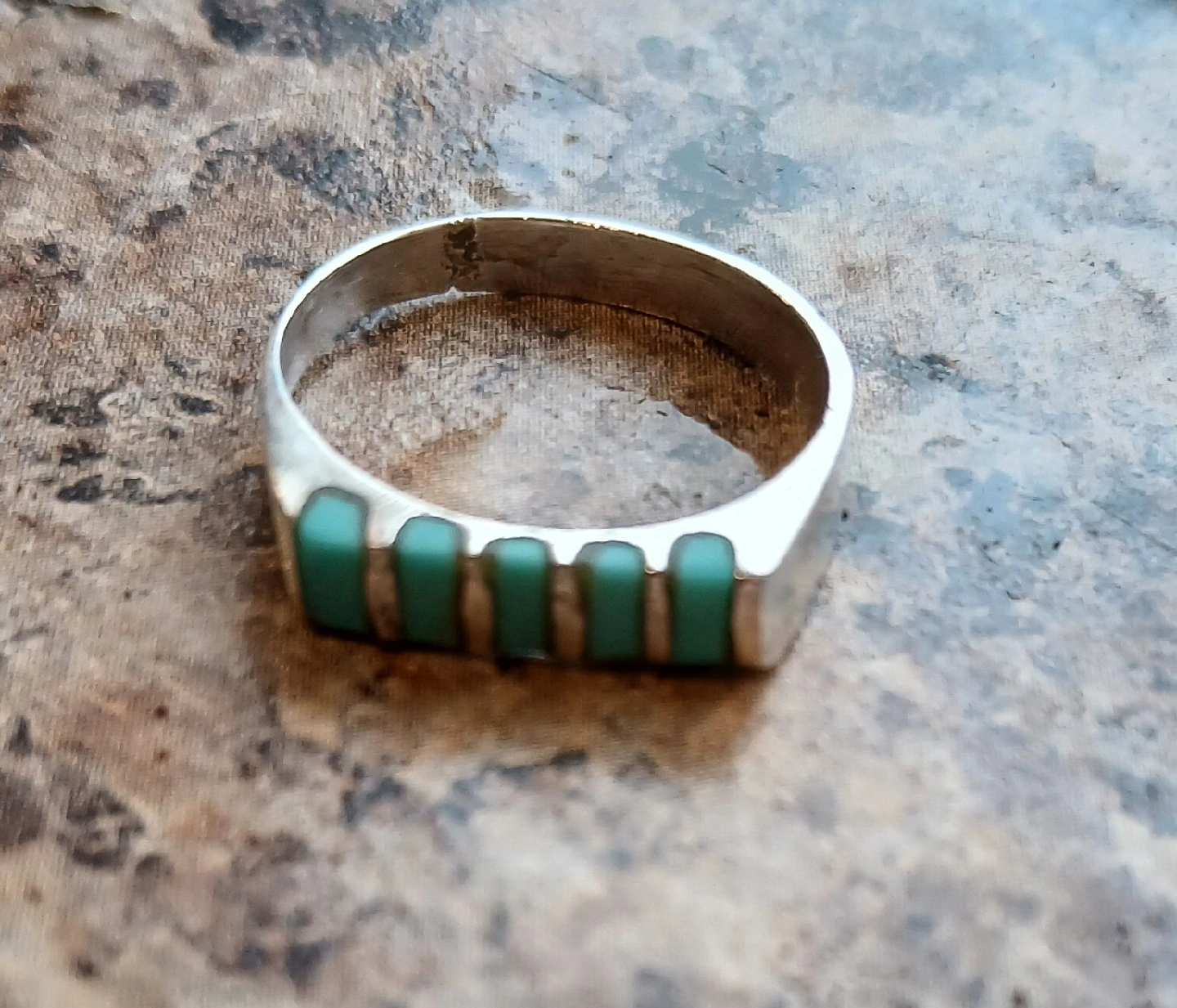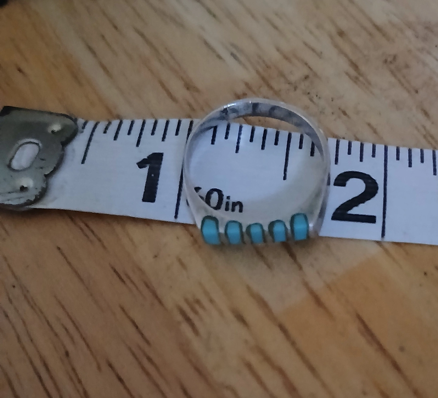 Here's a lovely silver ring featuring a turquoise inlay! It's in great condition and measures about size 7 according to the ruler in the picture. A simple and elegant piece to add to your collection