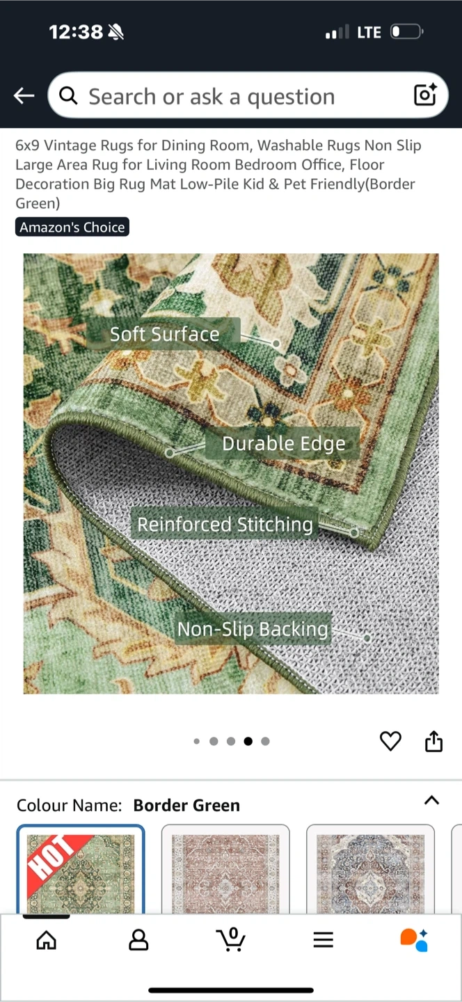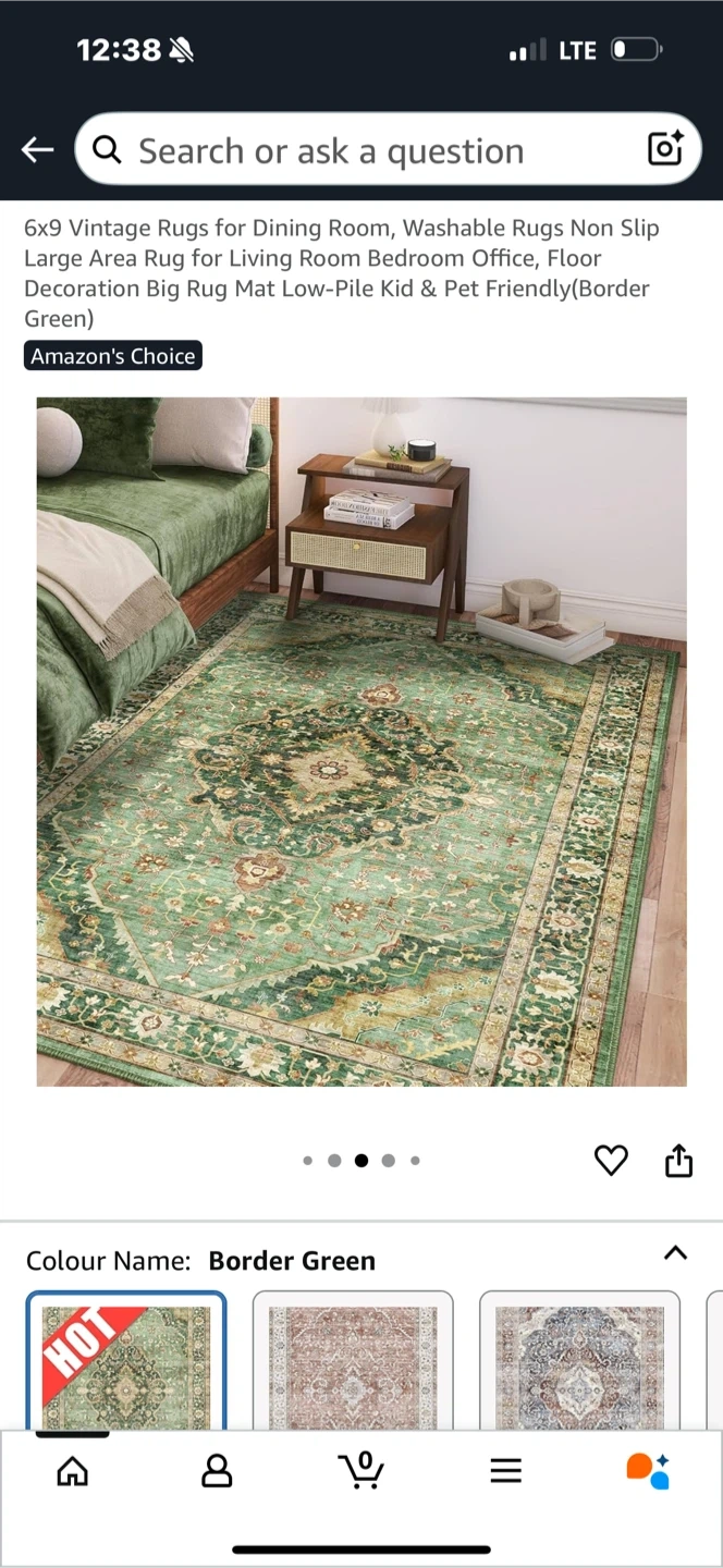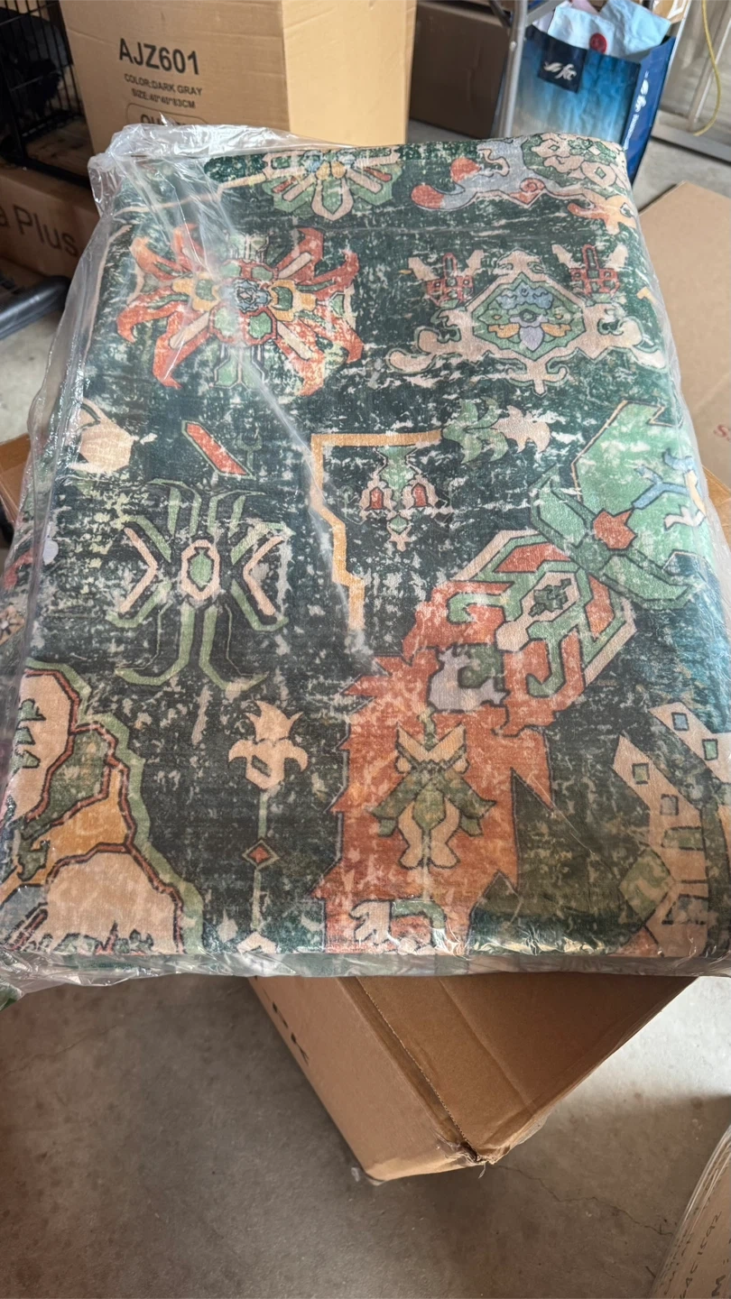 Selling a 6x9 vintage style area rug in border green! It has a soft surface, durable edge, reinforced stitching and non-slip backing. This rug is perfect for a living room, bedroom, office, or even a kid and pet-friendly space