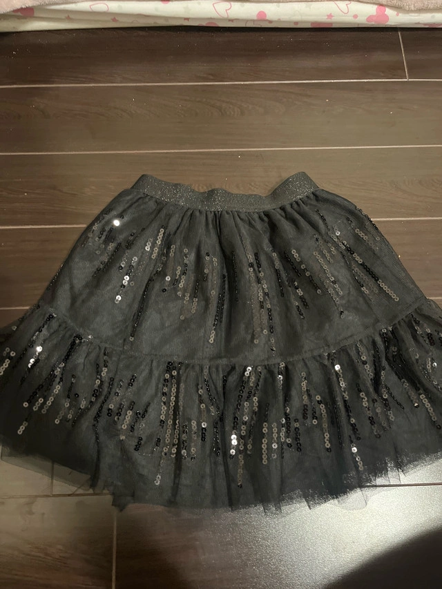This is a super cute black skirt for girls size 7-8, perfect for parties or dressing up! It features a sparkly elastic waistband, a layer of see through fabric and a second layer of frilly tulle and sequins. Specifications: * Size: 7-8 * Colour: Black * Material: Polyester, sequins, tulle
