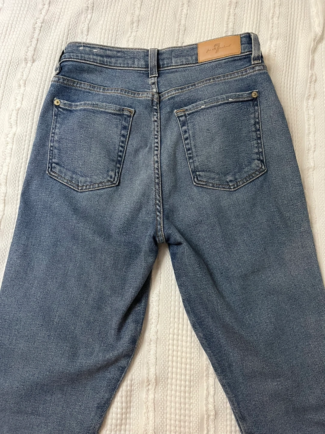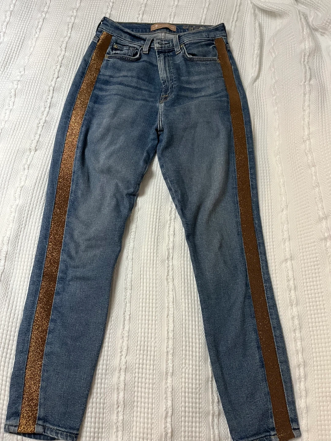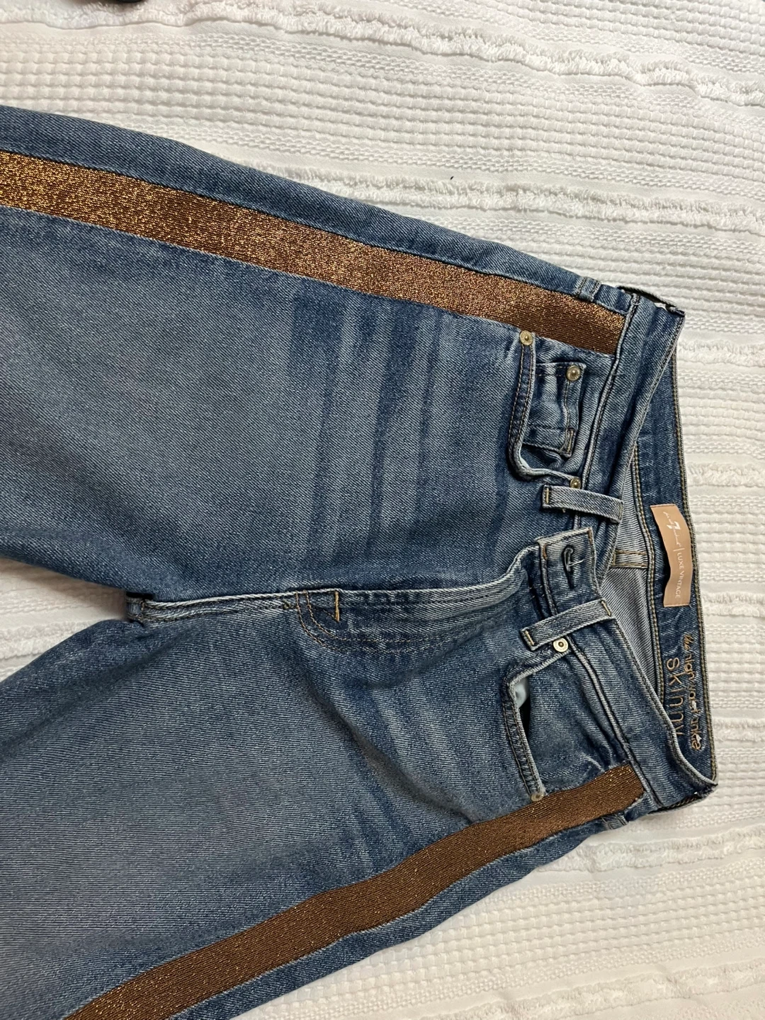 Selling a pair of 7 For All Mankind skinny jeans in size 27. These jeans are a stylish denim wash with a unique gold glitter stripe down the side. They're in great condition and ready for a new home!
