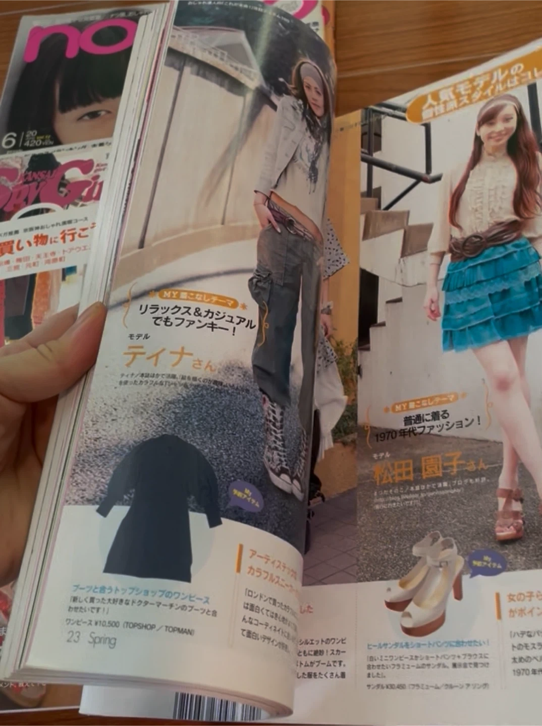 Pick up at Don Mils & Steeles Set of 7 vintage Japanese fashion magazines from 2006–2007, featuring casual everyday fashion and street fashion: • Non-no (4 copies) • Spring • SEDA • Spy Girl Select NOTE: Please check the video for a preview of the magazine contents to make sure the fashion styles match your preference before purchasing. Condition: Fair condition with some signs of aging typical for magazines. (one copy of the Non-no magazines has some writing on the back cover.) Perfect for collectors of Japanese fashion magazines or anyone interested in Y2K vintage fashion inspiration.
