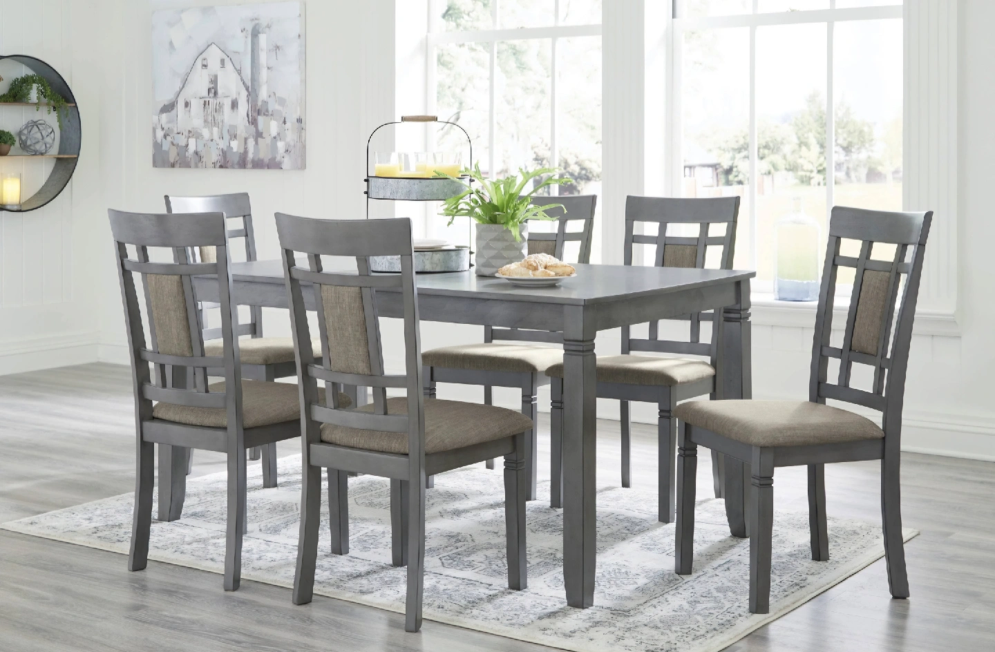 Modern 7-piece dining set includes a 60" table and 6 matching chairs. Features a sleek grey wood finish and upholstered seats for added comfort. Stylish yet classic design fits any dining space—perfect for family meals or gatherings. ✅ Brand New 🚚 Warehouse Sale – Delivery Available 📦 Assembly Required Table Dimensions: 60" L x 36" W x 30" H Material: Wood with grey finish Style: Modern