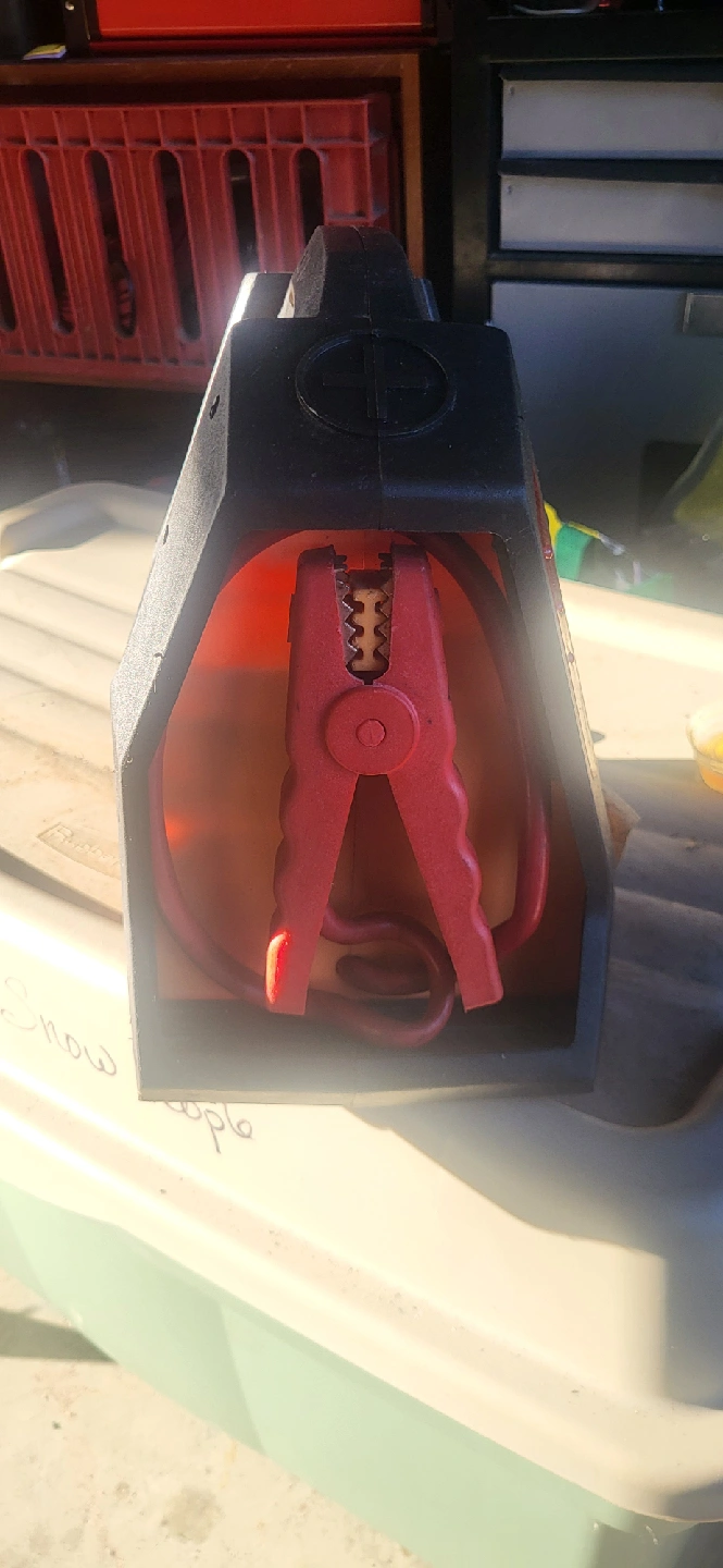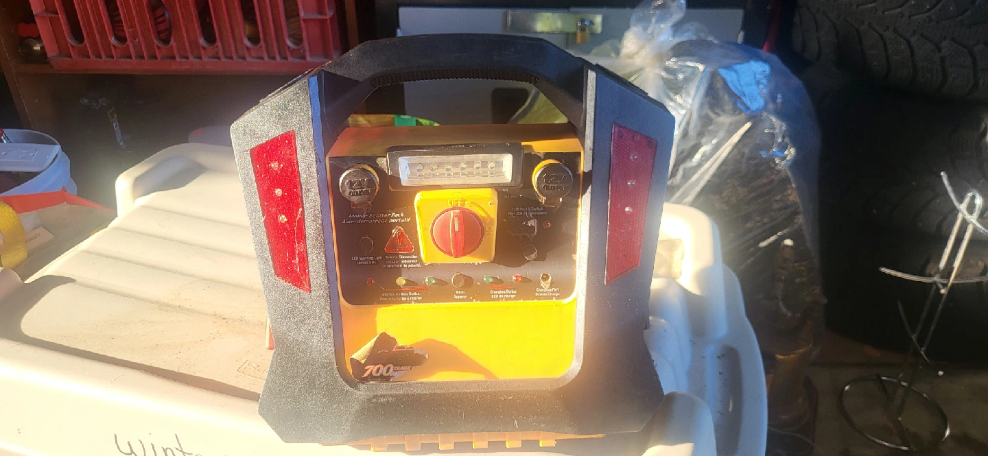 Offering a portable 700 amp jump starter. It comes with its charger and has colour-coded clamps for easy use. It's designed to be compact and easy to store in your vehicle for emergencies