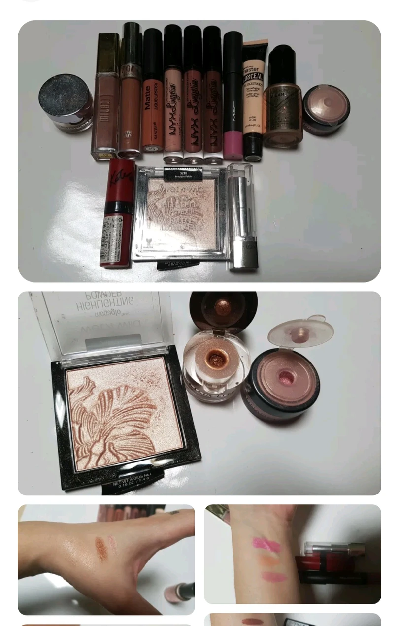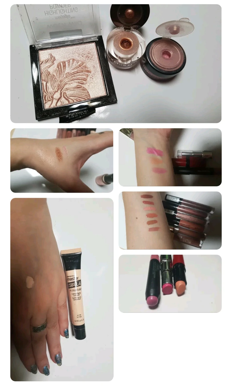 All products are used / swatched Highlighters Wet n wild - megaglo highlighting powder Annabelle - perfect gleam custom highlight drops Eye shadows Annabelle - golden pink Marcelle - lux eye dust bronze millionaire Lip stick Revlon - ultra hd sweet pea Rimmel london - lasting finish by kate lipstick Mac - patentpink lip pencil Liquid lipstick Nyx - lingerie x3 Santee - matte Aoa - studio wonder studio Milani - amore matte Concealer Maybelline - new master conceal by face studio camouglaging concealer I will make sure I sanitize everything but once you receive, please also sanitize.