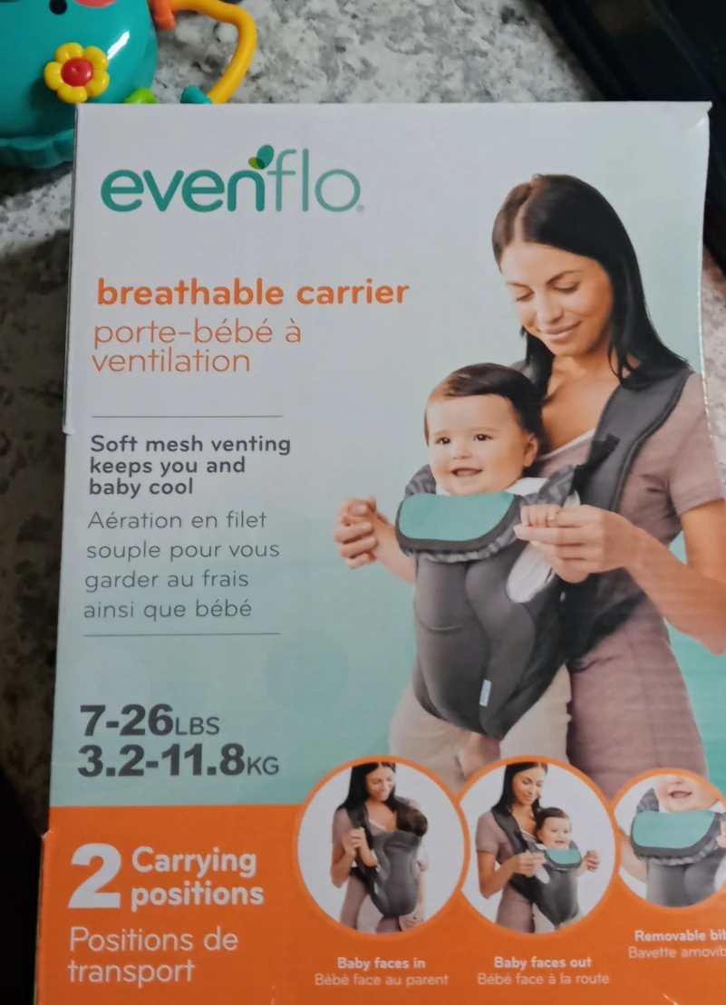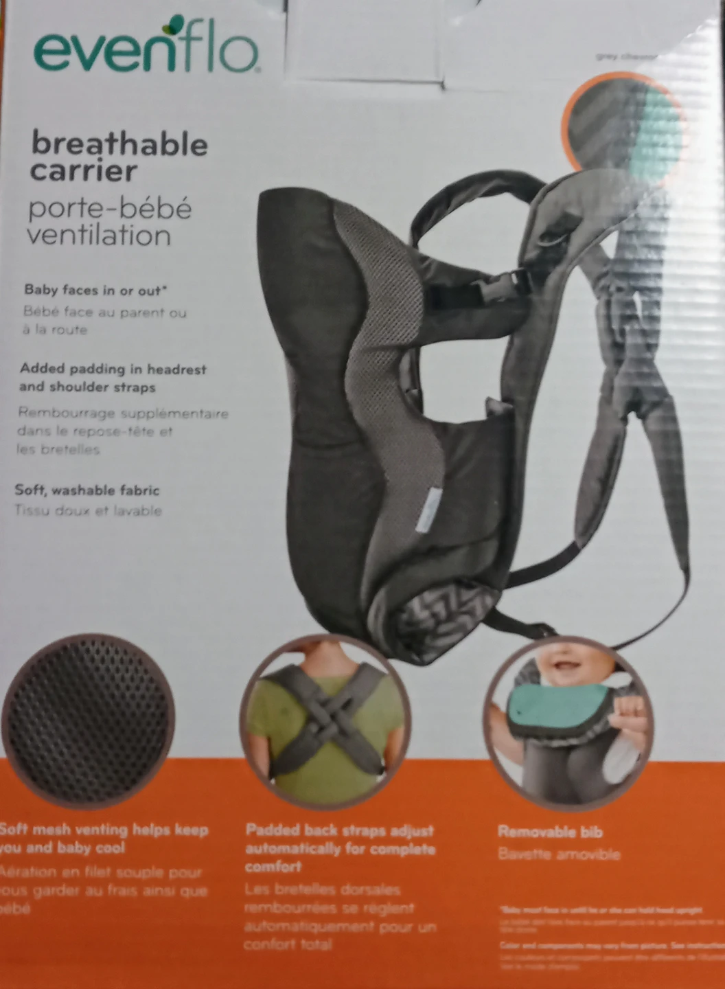 Evenflo Carrier Baby carrier is in excellent condition, like new. No scuffs, marks, tears or flaw of any kind. Very useful, comfortable, safe and helpful! Keeps baby happy, comfy and safe while providing comfort for the adult, ease of mind and the ability to use hands for chores or other activities! Features: 2 carrying positions- (baby can face in or out), Breathable mesh material provides comfort for adult and baby, 1 Removable bib (never used), Padding in head rest and shoulder straps, Secure lock buckles, and Adjustable back straps for comfortable fit. Weight : 7 – 26lbs If you are interested or have any questions, feel free to send a message anytime! Thank you!
