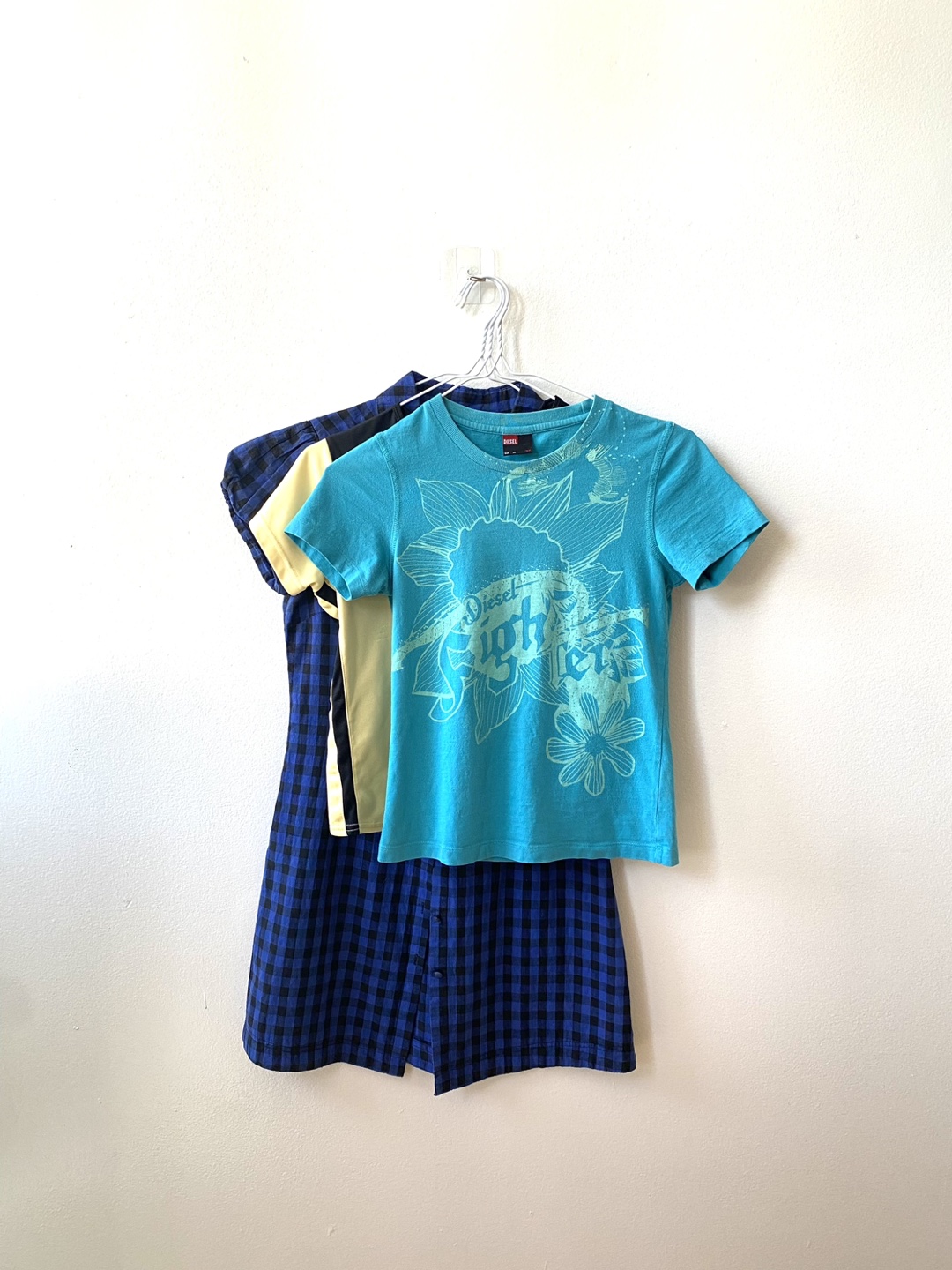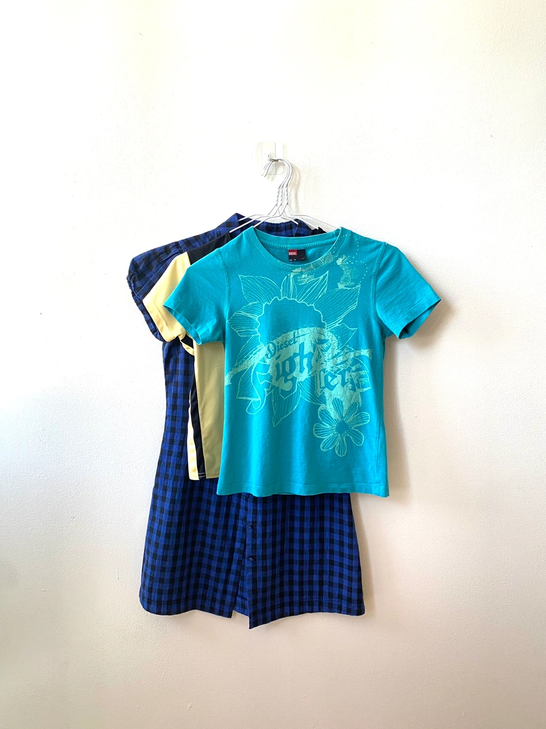 Diesel/Nike/New Cover 3pc XS T-shirt lot. All of them fits true XS! 10$ for all 3pc!!😁💐 🍀Diesel blue T-shirt with floral print on it, XS. 🍀Nike yellow/black Dri-fit sporty top, size 0-2. 🍀New Cover dark blue plaid dress shirt, fits XS.