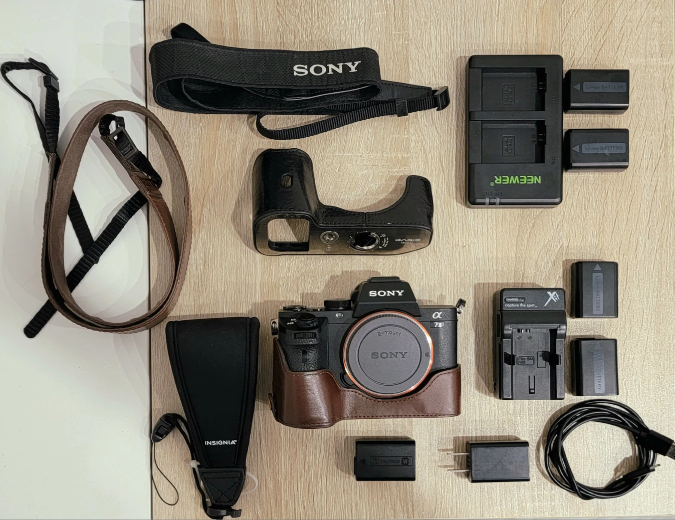 Sony a7ii (body), 2 SD cards SDXC 95MB/s (128GB each), 5 batteries, 2 external chargers & cable charger, 2 nice leather base covers, 2 camera straps, 1 hand strap.
