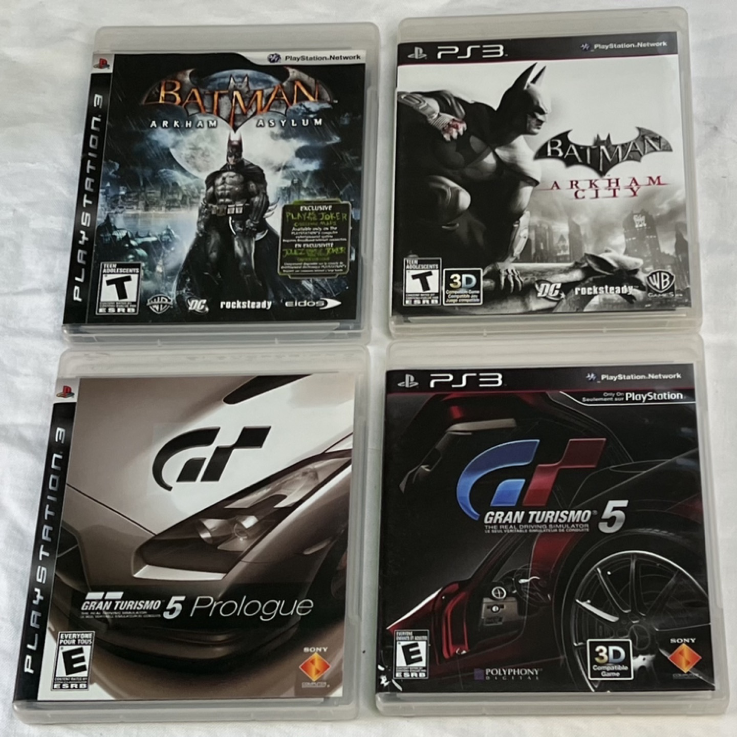 PlayStation Games Bundle includes: 1. Gran Turismo 5 2. Gran Turismo 5 Prologue 3. Batman Arkham City 4.Batman Arkham Asylum