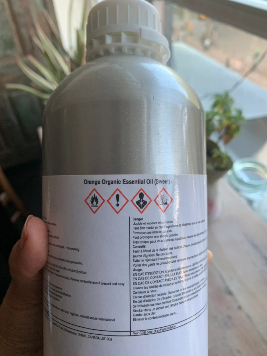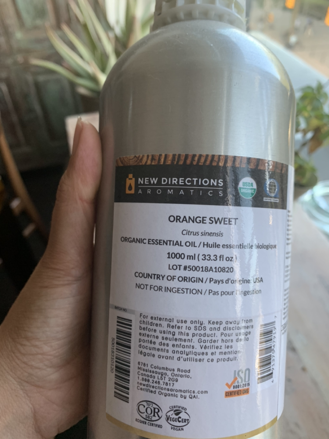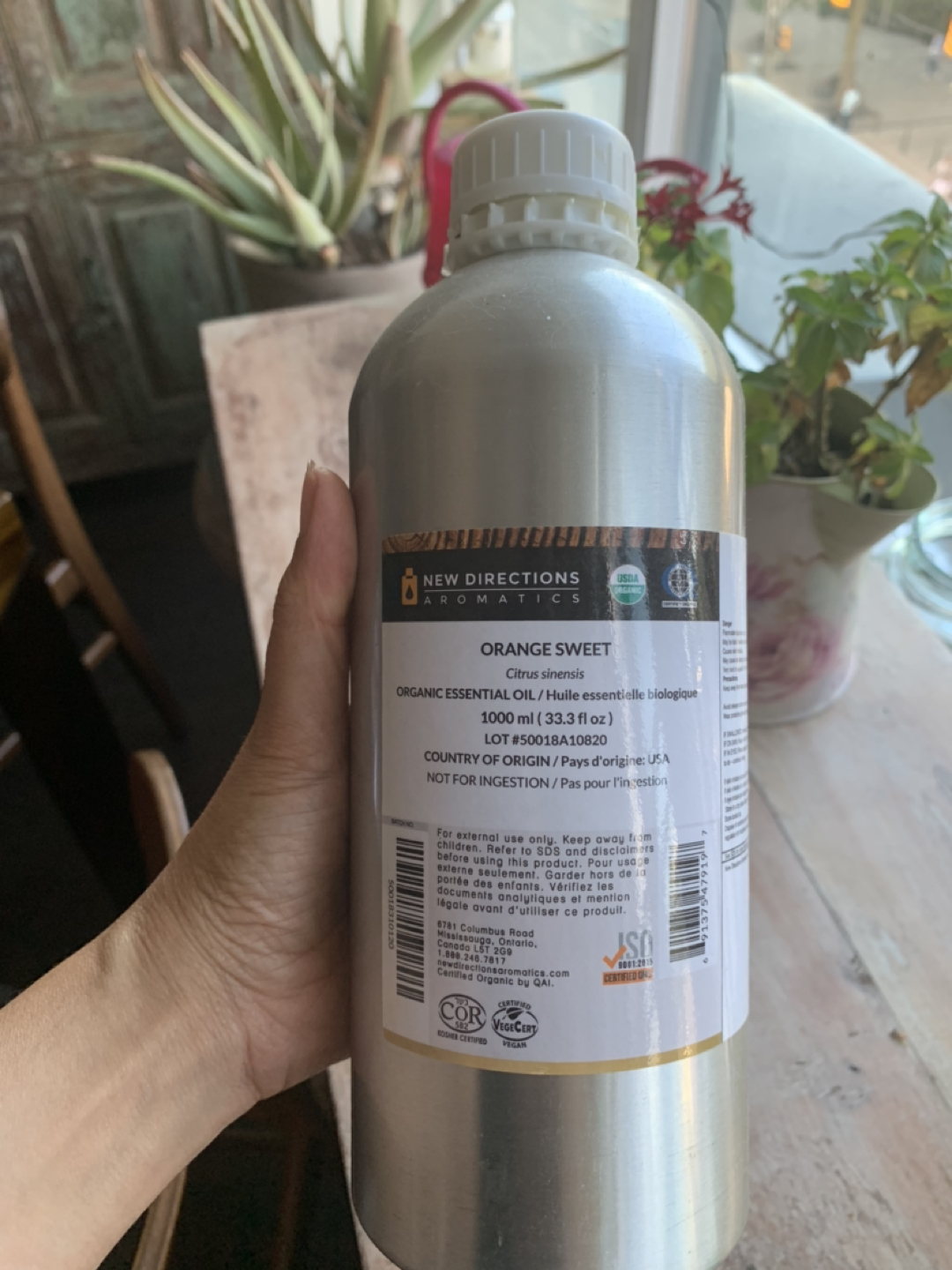This is a more than half full bottle of organic sweet orange essential oil. Originally 1000ml purchased from wholesaler: New Direction Aromatics. I used several a bit when I had a cosmetic business that I have now closed down. Retail is $50.99+ tax and shipping with a minimum spend as it is a wholesaler. My guess is the bottle is just over half full. Pick up near Queen and Woodbine