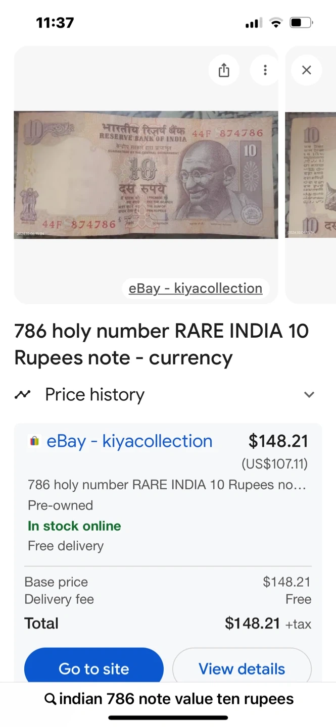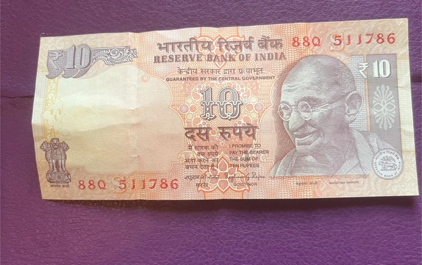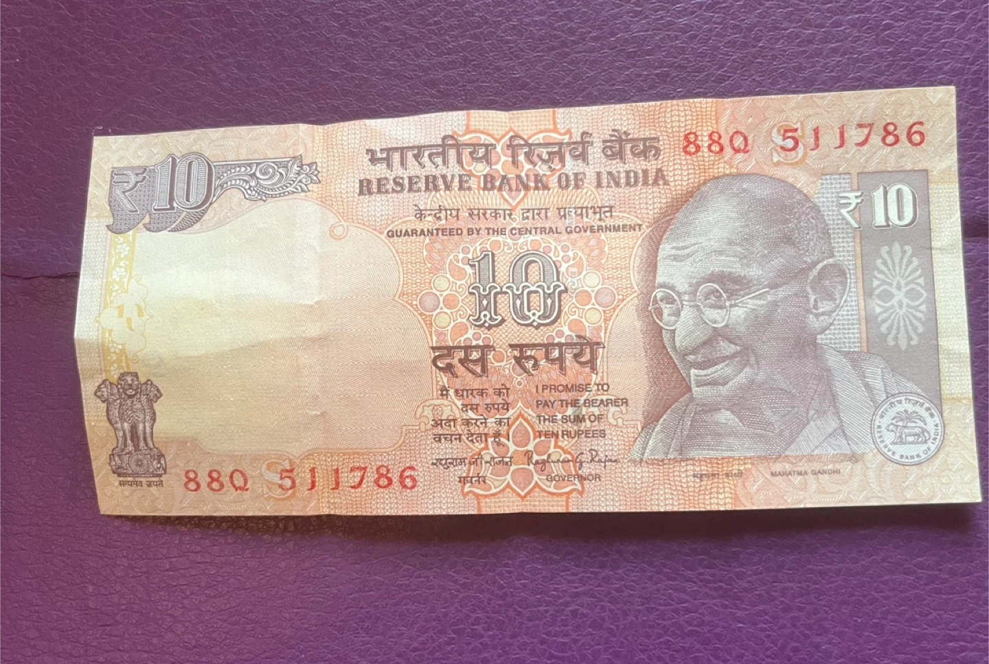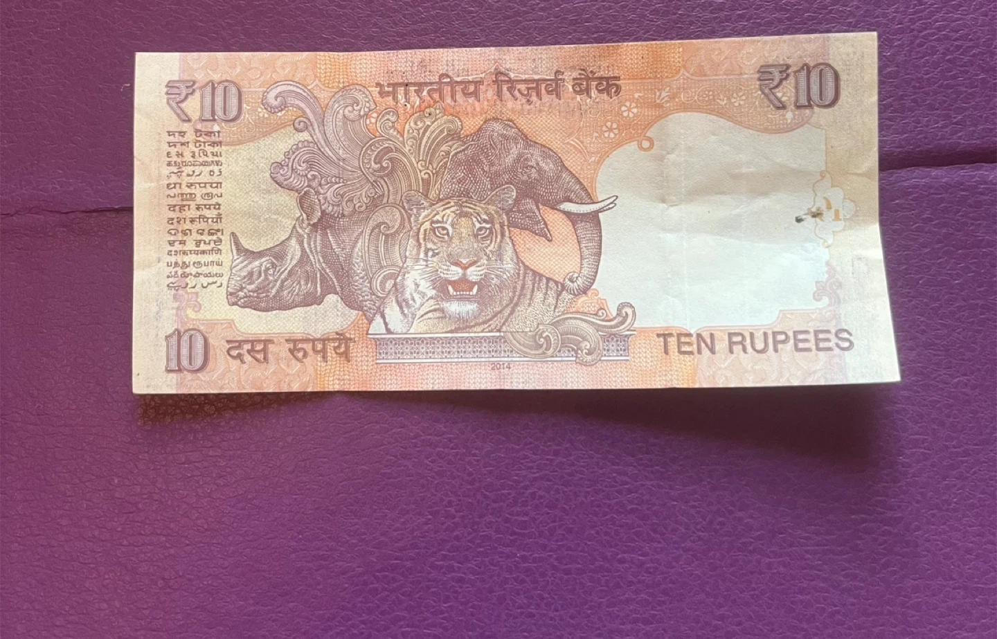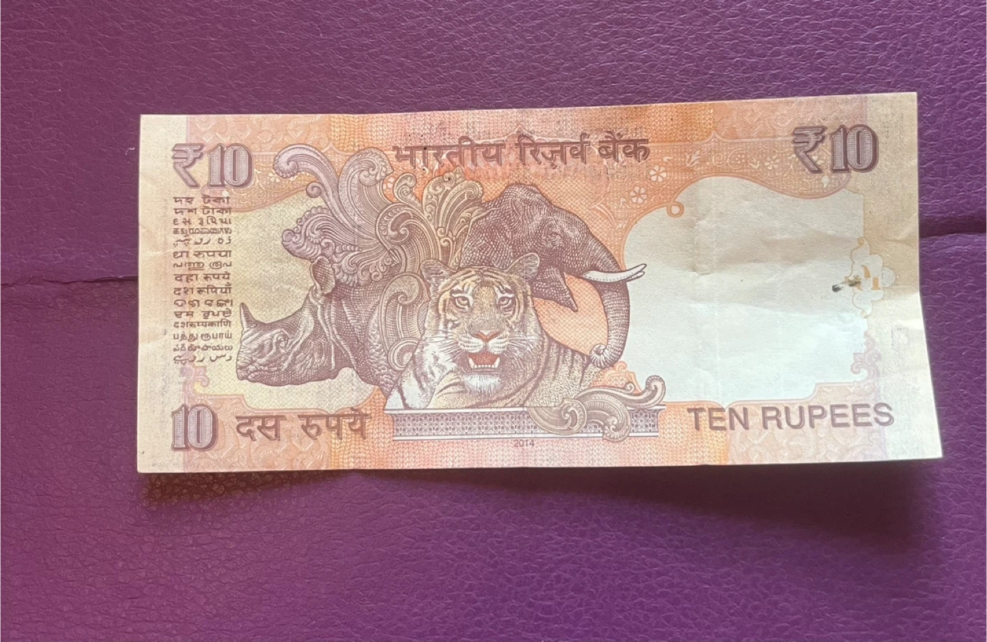 Selling an India 10 Rupee note. It features Mahatma Gandhi on one side and an elephant, tiger, and rhino on the other side.